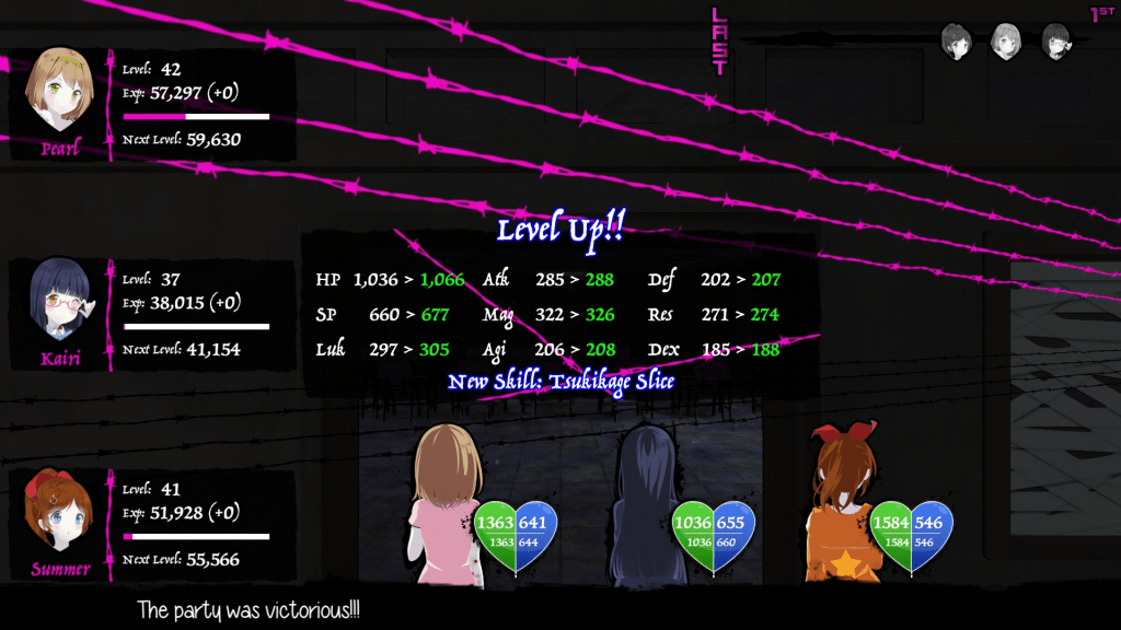 At the end of combat, the party is rewarded with experience points, leveling the active girls that participated in that battle. As each girl levels up, new skills, abilities and stat boosts are applied as that character grows. The amount of experience earned depends on a few different factors, the strength of an enemy and total number of enemies in the battle, with boss battles providing the highest rewards for the party.