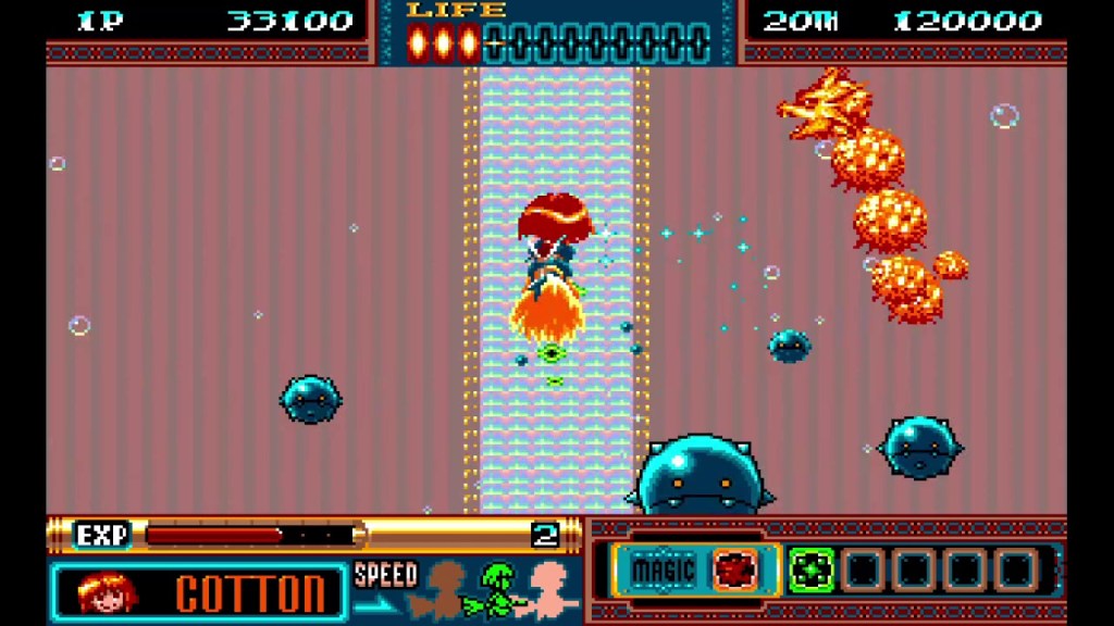 - Speed – Cotton has three speeds that she can use when flying through the stages, with a slow, medium and fast speed setting. The speed setting that the player uses doesn’t just affect Cotton, but the scrolling speed of the stage and the speed of enemies on screen potentially increasing the difficulty of the game. Luckily, the speed of the bosses isn’t affected by Cotton’s speed.