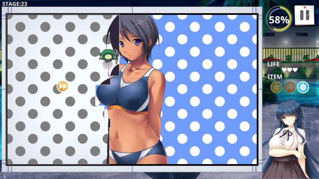 During each stage enemies will spawn in at the beginning and move around the play field, taking a life if the player or an incomplete line makes contact with them or their attacks. The player is safe when they are on the edge of the field for the most part, but there are enemies that invade the safe zone. It must be noted, that enemies can be defeated by capturing them within areas that the player clears during play. However, enemies aren’t the only thing that can get in the way of uncovering the cute girls.