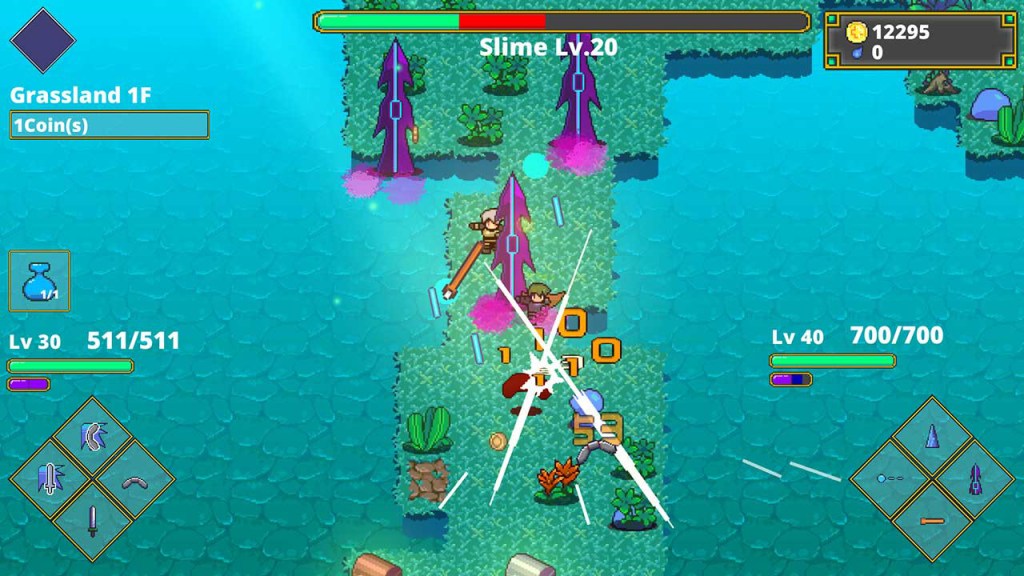 Inside the dungeons, the player must traverse the different floors of each region of the world map and battle the monsters within. The inhabitants of the labyrinth will try to stop the player, attacking when they are within range with an indicator that appears above their head. Each enemy that is defeated grants experience to the player, along with the chance to drop coins and other resources. However, one enemy in each floor holds the key to the dungeon door, which is collected by defeating them.