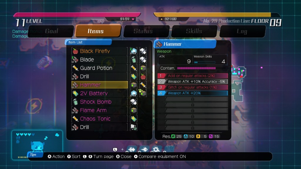 While exploring the wastelands, there are three very important things for the player to keep track of. The first is HP, which measures the total health of the little robot, when this is depleted they are defeated and sent back to the home base. Next is EN, an energy meter that will be depleted over time, with each action and special ability using up the precious energy. When the EN meter is empty, the players HP will be drained, leading to a quick death if not remedied quickly.