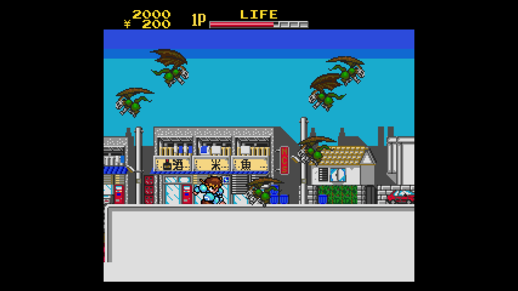 As the player progresses through the stage, they can collect money from enemies that are defeated which is added to their total. There are also special power-ups that can help the player get through the stages, with the drops including health recovery items, limited time invincibility and a temporary super jump. These items will usually drop randomly, but there are some sections that have predetermined drops.