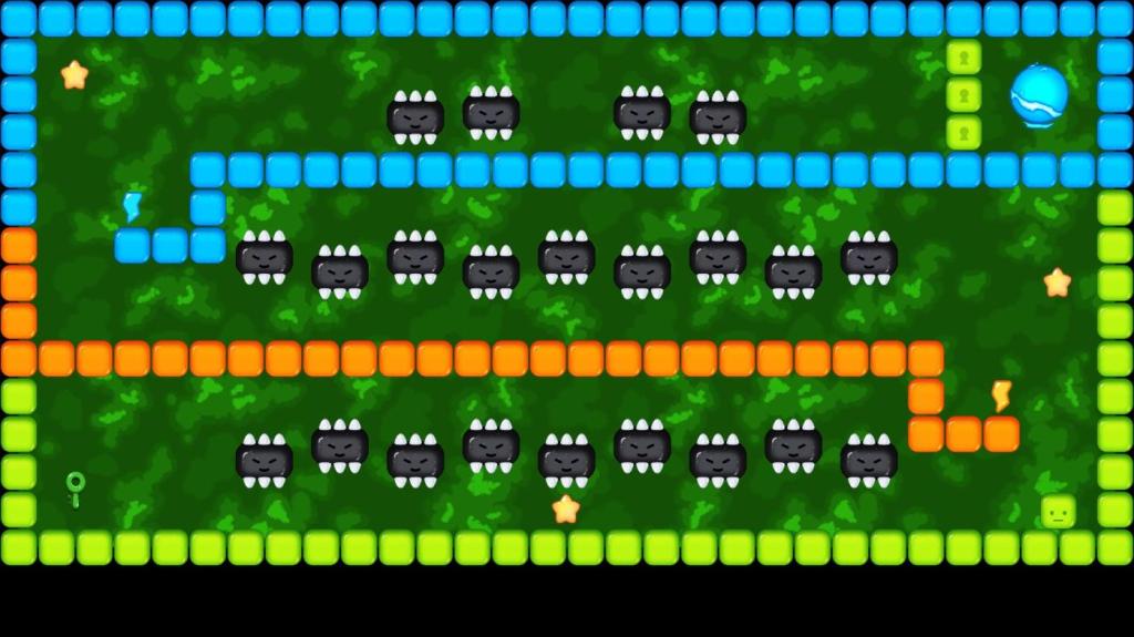 Within the stages, the player must collect keys that match the active color to open doors, with lightning bolts that will change the color of the player cube. The player must take great care while trying to reach the keys and exit, as there will be spring blocks that launch the player into the air, spikes that will move on tracks and very tight platforming.