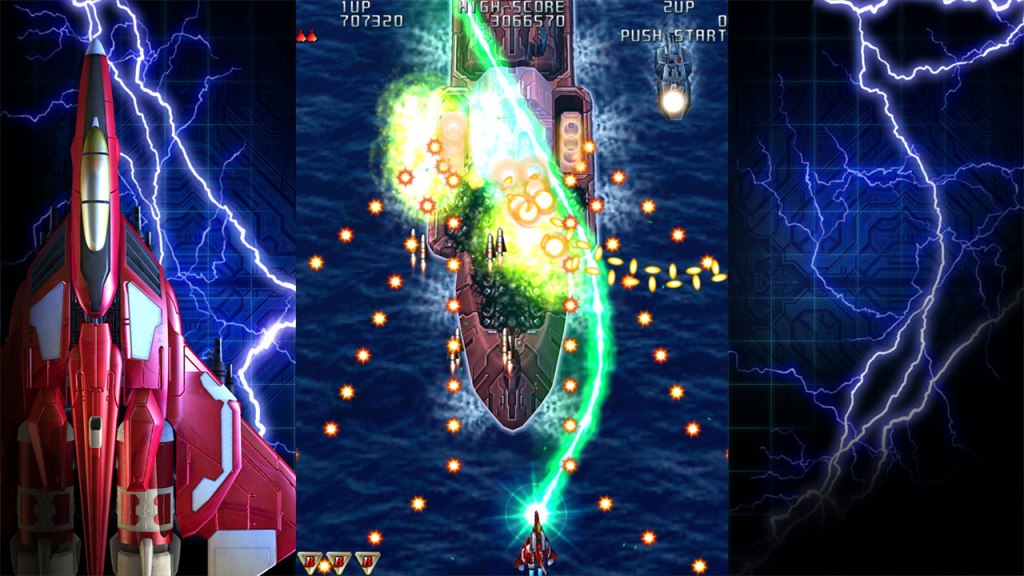 - Arcade Mode – play through the original game, taking on all 7 stages of Raiden III. This game mode (as well as the others) can be played alone or with a partner, battling the waves of enemies together while competing for the highest score possible. Once stages are cleared, the player will be able to select them from the menu as their starting point.