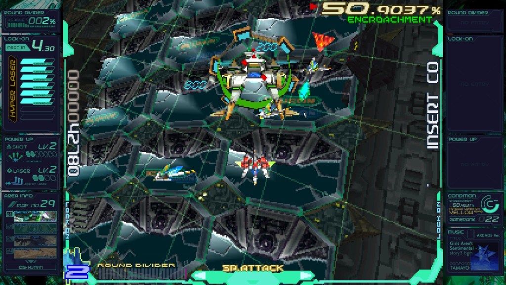 The weapon systems of this game have been altered too, with a new bomb attack called the Round Driver, as well as the Hyper Laser if one part of the enemy is targeted with all shots. These special weapons give massive point boosts to the player score and can help with lowering the encroachment rate. There is also a special third ship that can be unlocked for players to experiment with, either by meeting special conditions or via a secret code.