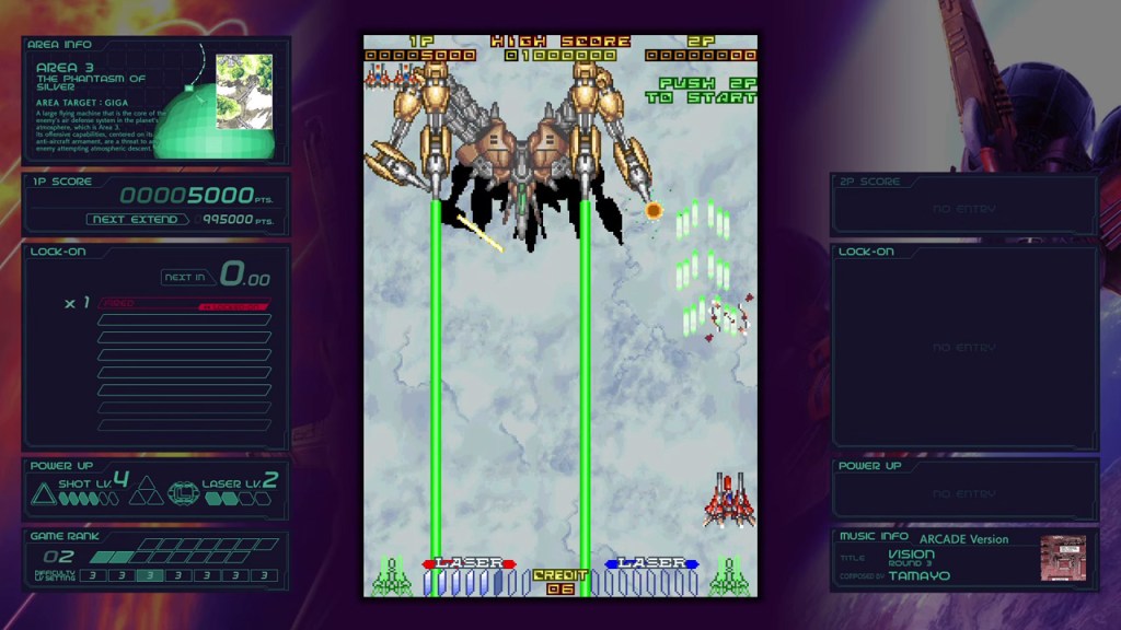 Presentation – as a set of arcade titles from the 90s, the visuals may seem primitive to some, but the graphical look to each of the games is still pleasing to the eye. The original graphics of these games still look good, with several options for filters and different aspect ratios, alongside new HD versions of RayStorm and RayCrisis in this pack. There is some slowdown in the 3D games, but this was present in the original versions of those titles, so it isn’t a fault of the system.