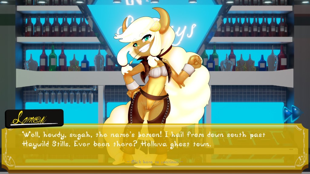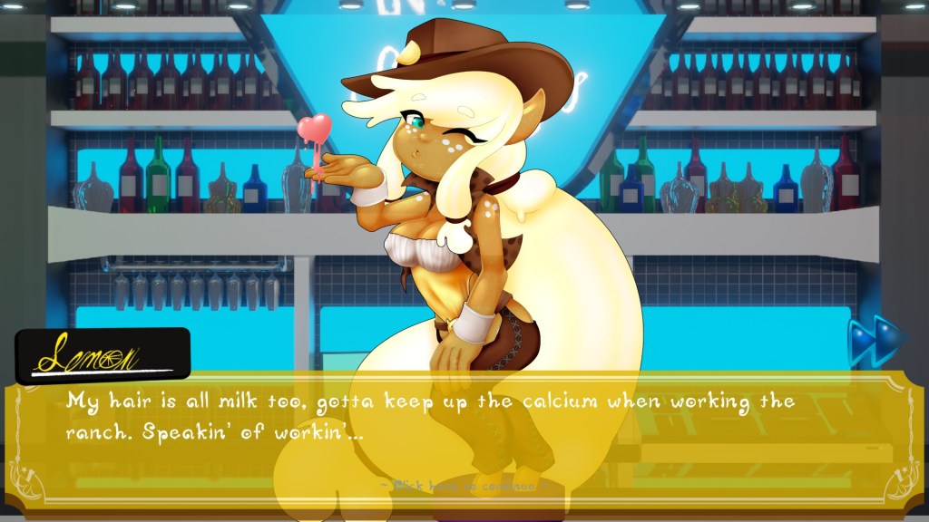 The new addition to the bar staff also comes with a set of 4 shifts for the player to challenge, each with their own fully voiced dialogue from the talented VA Pixie Willow (Twitter/X). There is also the inclusion of special intimacy scenes that can be unlocked for players to enjoy, unlocked during the course of that route. Alongside the extra artwork, shifts and dialogue, Lemon has her own unique music which is a mix between a Wild West trail theme and a dance anthem.