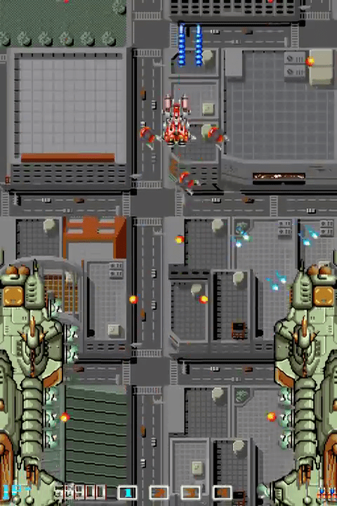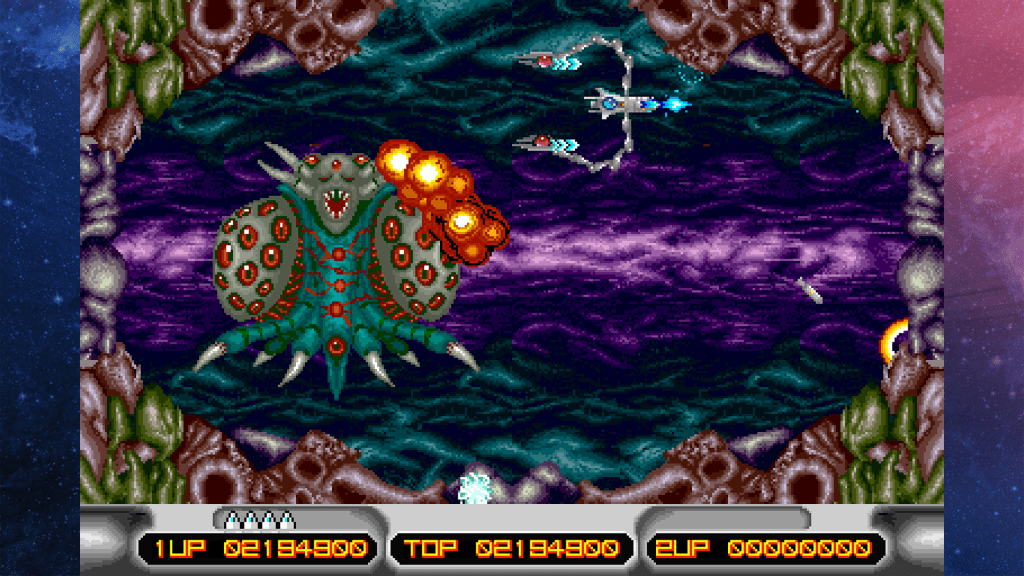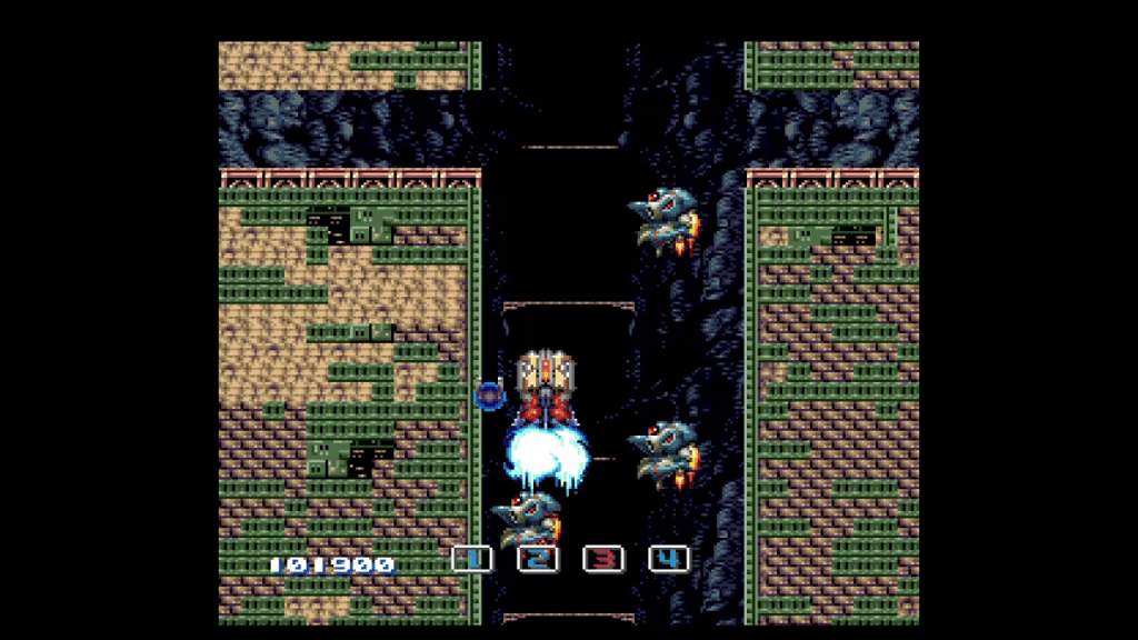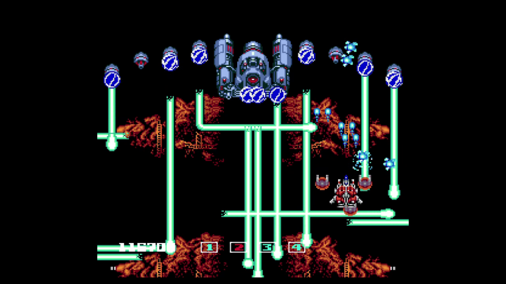 This title is the most different of the three in the package, with the action playing out in a side scrolling fashion, with a vertical segment during the game. The gameplay loop is more of the standard shooter fare, where the player makes their way through the stage and then fights a boss at the end of the stage. The game will also loop upon defeating the final boss, starting again from the beginning and increasing the pressure on the player.