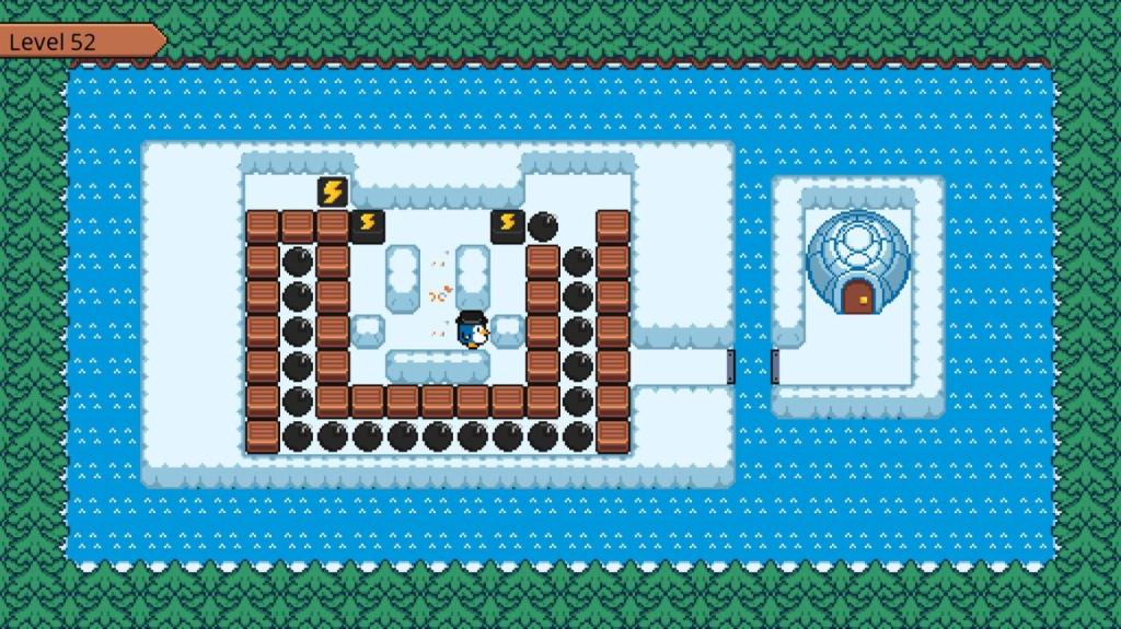 Gameplay – SokoPenguin is a relatively simple puzzle adventure, where players must solve single screen brain teasers to reach the igloo goal to clear the stage. The stages start off simple, with the player pushing blocks to reach the goal. But as the player gets further into the game, new challenges will be introduced. These challenges include bridges that need power blocks, spikes that will destroy blocks and ice that carries blocks across the stage.