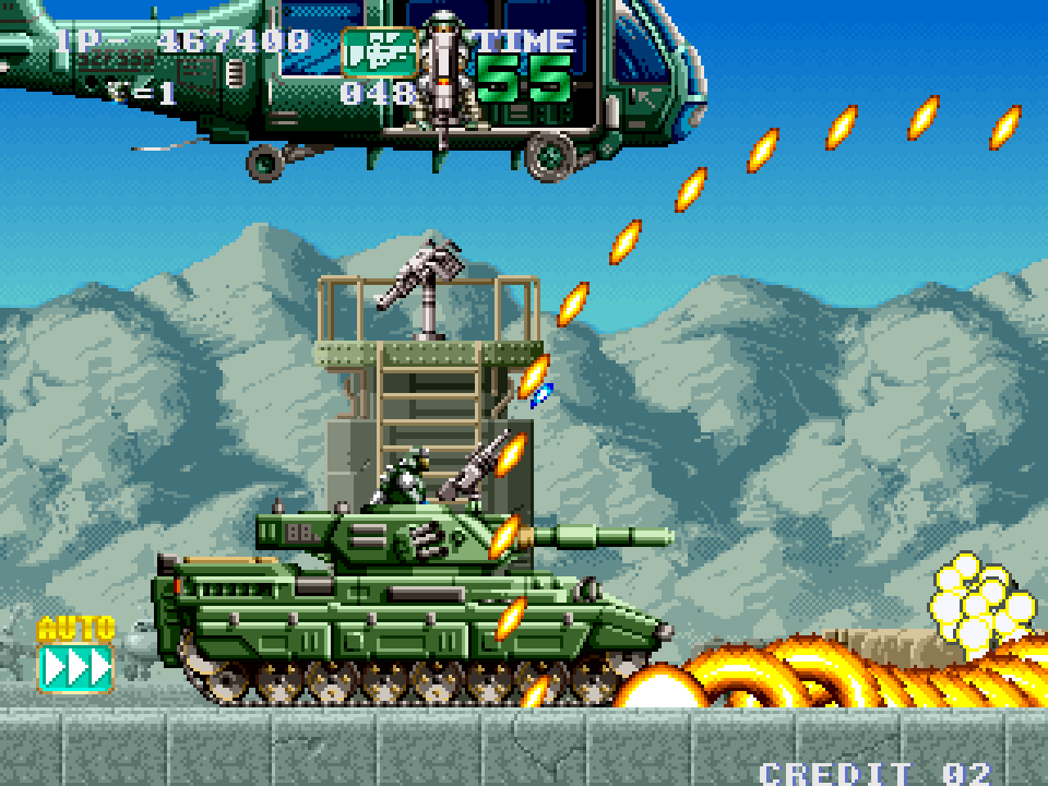 New to this game are female POWs that can be rescued by the player and medals to collect. For all of the medals and rescues that are successful, the player will gain bonuses at the end of a stage. When the player clears a stage, they will receive bonus points and at different medal milestones, the player will rank up, with 7 different rankings. Unlike the other games in this collection, this title will also loop indefinitely, allowing for massive scores to be achieved.
