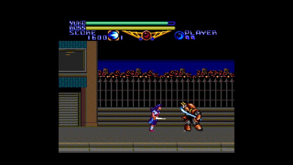 At the end of each stage, the player will encounter big boss opponents which are signalled with an on screen warning before the battle starts. The health for the boss appears on screen below Yuko’s, which is very helpful for players. The last thing to mention is the outfit changes, during the course of the adventure, Yuko will gain new armor which will change her overall appearance. This appears to have little impact, but is a good narrative plot point.
