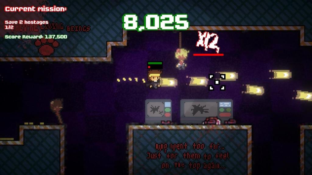 During a run, the player will be able to pick up different items dropped by enemies and hostages. The various items include weapons, which last until the ammo bar runs out, power-ups that increase damage and health packs that restore damage taken. There are also upgrades that last for the duration of the run, like increased fire rate and maximum health boosts. This title has a roguelike feel to it, so any time the player dies collected upgrades are lost.