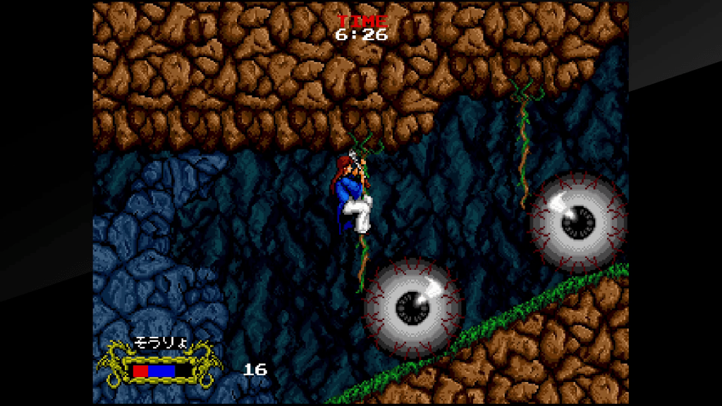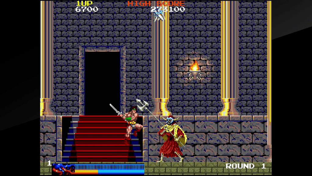 If all of the player health is reduced, Rastan will die and the player continues from a checkpoint. Enemies aren’t the only threat to the player, as there are poisons that will drain the vitality of the hero, alongside pitfalls and traps that can instantly kill. When the player runs out of lives, they will be able to continue by using a credit. At the end of each round, the player will encounter the boss of the stage before moving on.