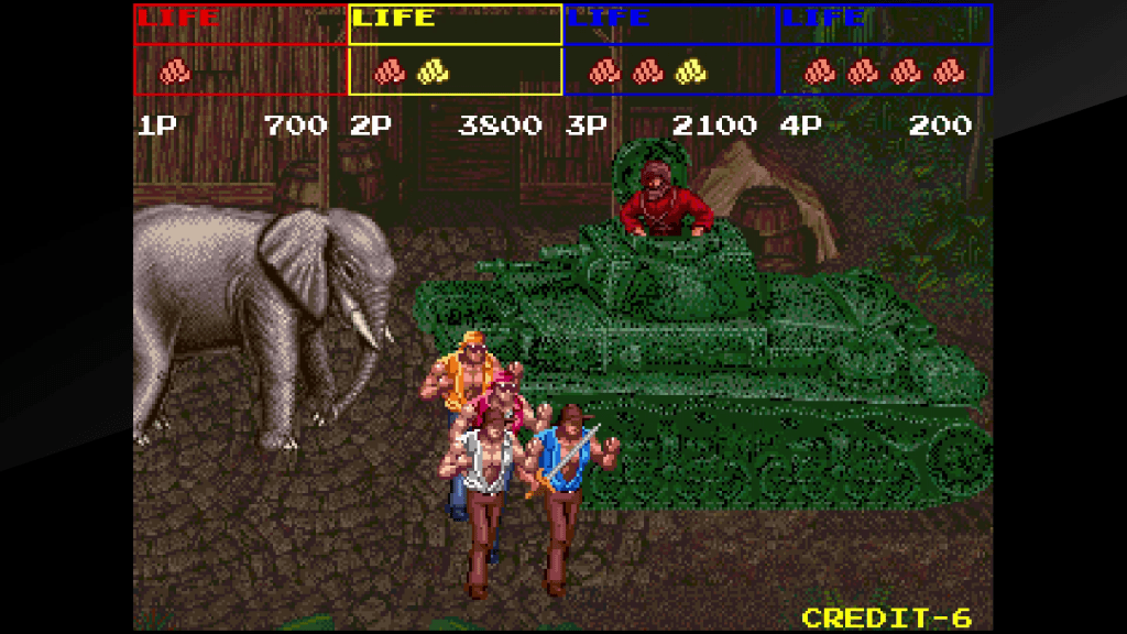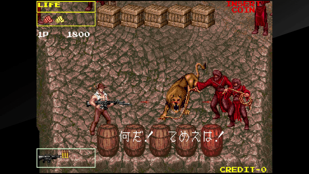 Weapons can be collected during the different stages, with melee and ranged weapons that can be found, including a whip, revolver and even grenades. These weapons are limited in use, but can devastate enemy numbers and players can even throw objects at enemies. There are 7 stages and a bonus game to play through, with wave after wave of foes to defeat. Players can also find animals to help them out, like deer and an elephant.