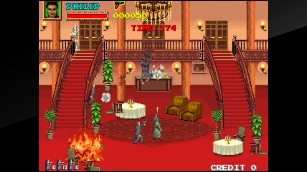 The game is split into rounds where the player must take down a set number of enemies, with the round target appearing at the start of the round. The action itself is unique, with a single screen where the player will move around and fight enemies. These stages are one big backdrop, where enemies will spawn in from all across the stage to attack the player. The detectives have a standard pistol with infinite ammo, as well as a close up melee attack.