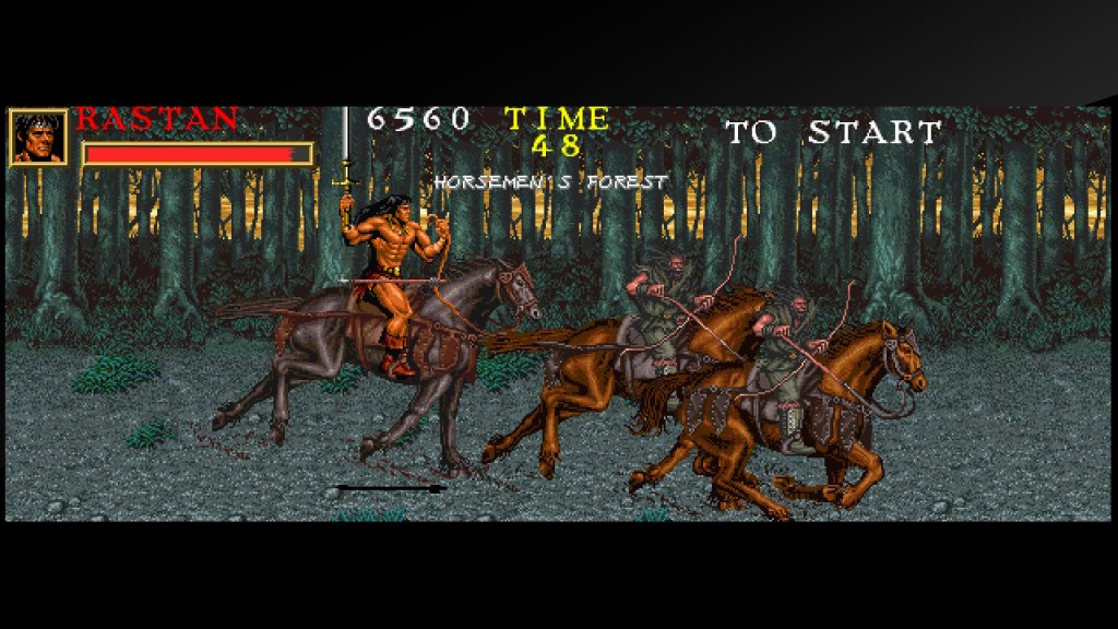 Rastan the barbarian bandit embarks on a journey to protect the Kingdom of Ceim, in exchange for riches and the glory that will be earned as a reward. This is a side scrolling hack and slash style action game, made up of a series of rounds that are split into individual areas. The player makes their way through the different areas, fighting monsters, collecting treasures and obtaining more powerful, yet temporary weapons, including an axe and flame sword.