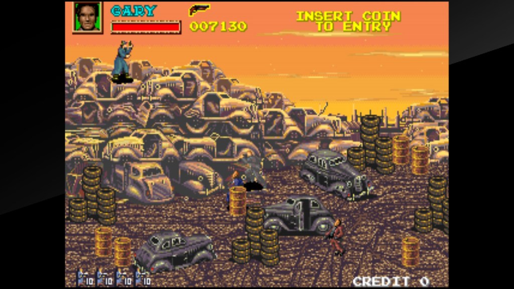 The stages are split into segments, with the run and gun style of action being the focus. Players will encounter dangerous bosses during stages, which are preceeded by a warning before they appear. While the bulk of the game is mostly the same, there are special sections that use an auto scrolling shooter style of play. These are brief and only make up a small part of the game, being little more than a distraction from the side scrolling brawling.
