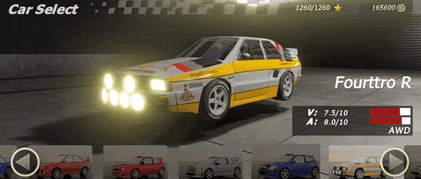 To be able to race in the different groups in Rally mode, the player needs to unlock cars for that group. The most common way to unlock the cars is by playing the Tour mode, but to get ahead with progression, the player can purchase cars using accumulated credits. This system allows players to approach the different stages at their own pace. At the end of a set of Rally stages, the player will earn credits, which can go towards unlocking new cars.