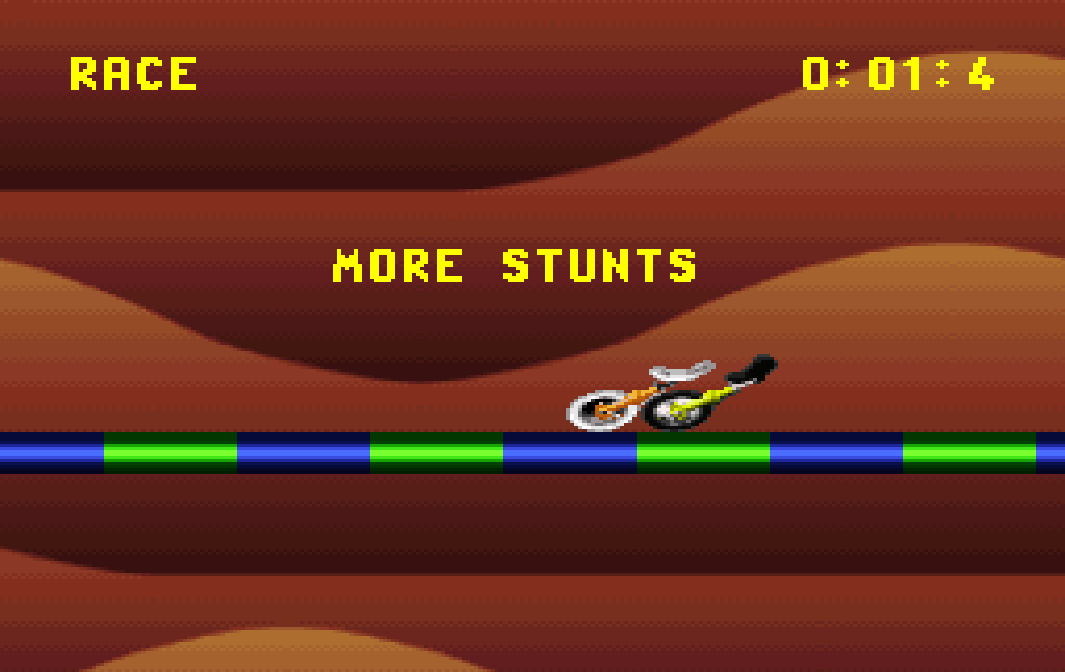 Then there are the stunt events, where the player needs to perform tricks to beat a target score. These stages are contained stunt tracks, where players must use the stage to get big air to perform their tricks. The stunts that can be performed consist of flips, twists and even head bouncing to gain high scores. As the player performs tricks, there are double, triple and even mega versions of the flips/twists, resulting in bigger and better scores.