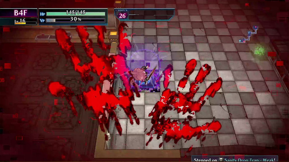 Speaking of Sanity, this is one of the most unique mechanics of dungeon exploration. Each time Sayaka delves into the Strain Area, she starts with her Sanity at 100%. This will gradually decline when moving, taking damage and from the traps of the Strain Area. As it decreases, Sayaka will fall deeper into madness, reducing her field of view and map visibility. If it falls too low, she has an increased chance to harm herself, reducing her chances of survival.
