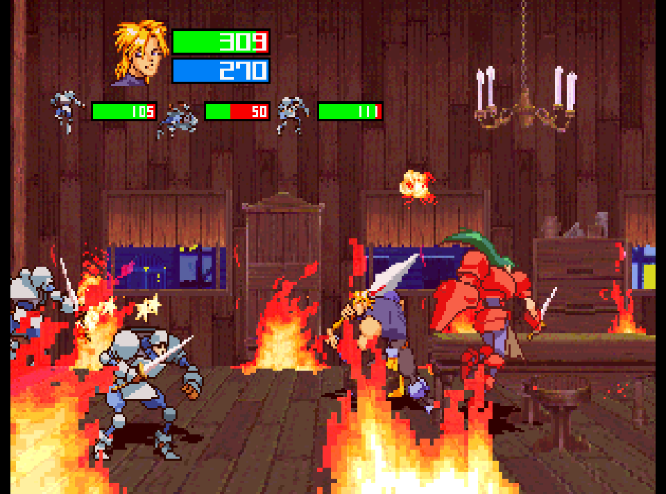 Guardian Heroes is a hack and slash brawler, set in a fantasy world of sword and sorcery. In this adventure, a group of adventurers encounter a mysterious sword, which may be the legendary sword they were searching for. While trying to relax for the night, they are interrupted by Serena, a royal knight who warns them that soldiers are coming to take the sword. During the commotion, their accommodation is set on fire and they flee.