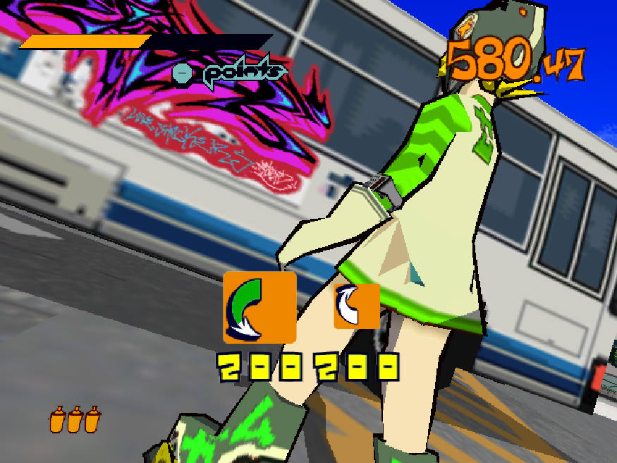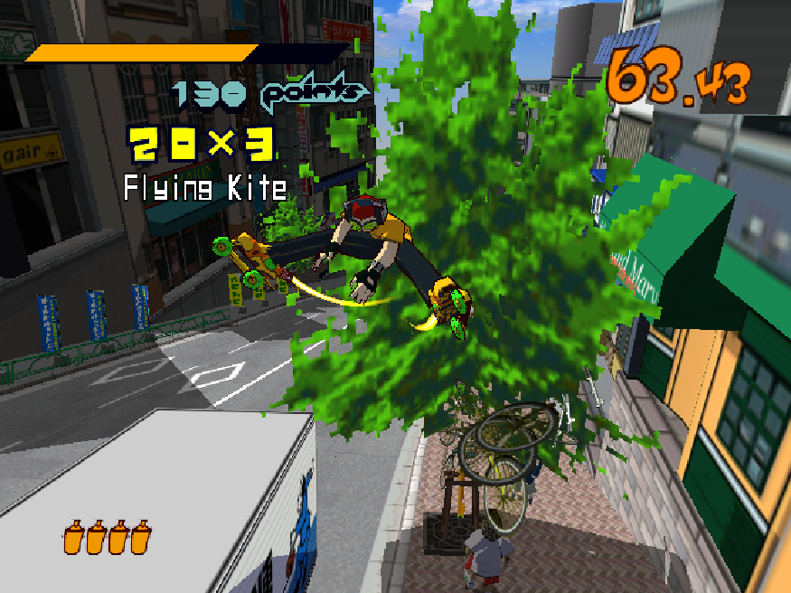 There are three types of spray cans that can be collected, with yellow ones providing a single graffiti use, Blue that give 5 uses and Recover cans, which restore stamina. The recovery cans are important, as there are several dangers to the skaters and their objectives. As the skaters travel through Tokyo-to, there will be water that they can fall into, cars that can hit them and other environmental hazards. But the most dangerous threat is the Police and Rokkaku group.