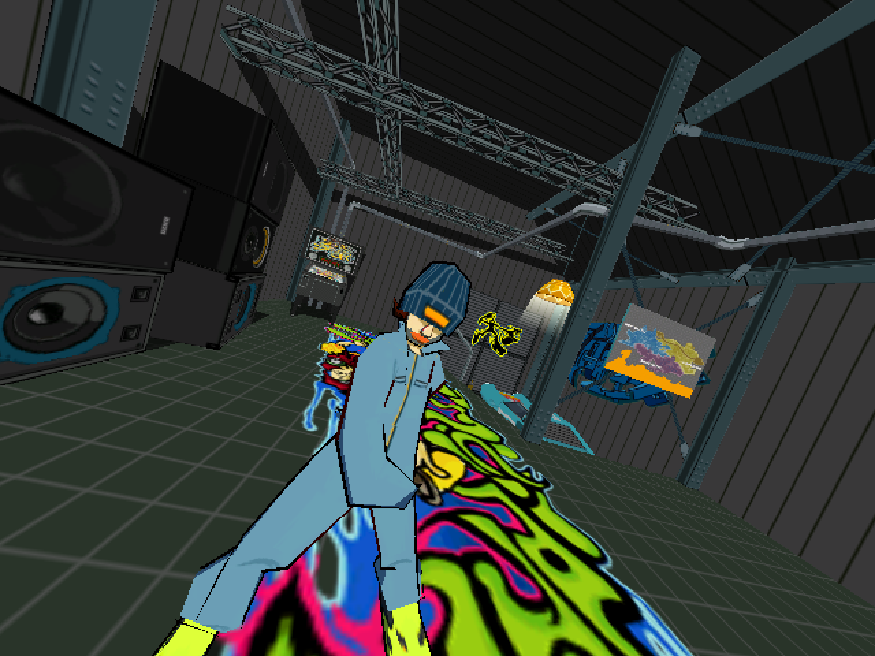 Inside the garage, the player is able to select the stage that they want, listen to music and change the graffiti that is used. Within the graffiti menu, the player is able to select from a variety of tags that have been unlocked, collected or even create their own. To be able to make a variety of different graffiti tags, using preset text and paint tools. The custom tags use up blocks on the VMU with different set amounts for the three sizes of small, Large and X-Large.