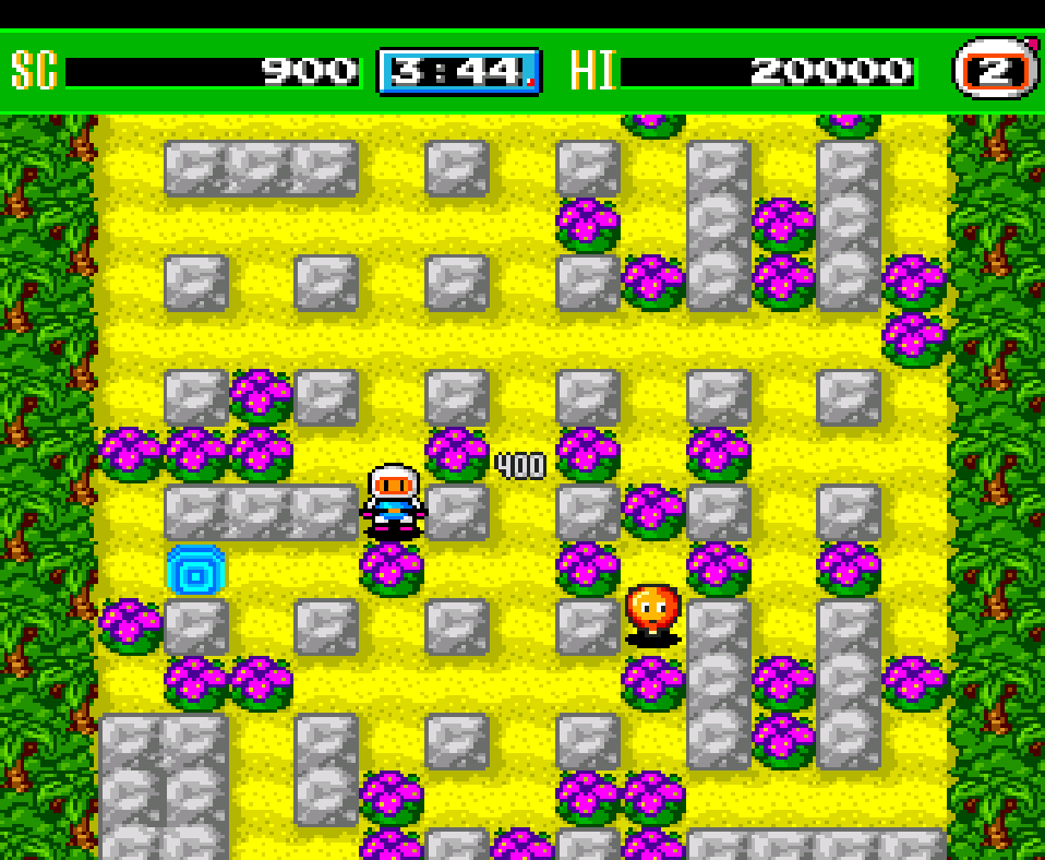 All of the stages and the mazes use a grid based tile system, with the four cardinal directions being used by the player and enemies. At the beginning of the game, the player will start off with a single bomb at power level one. The explosion range for the flames starts by expanding a single tile in all directions, destroying the soft blocks and enemies that make contact with the flames. The player will also die if they are making contact with the flames.