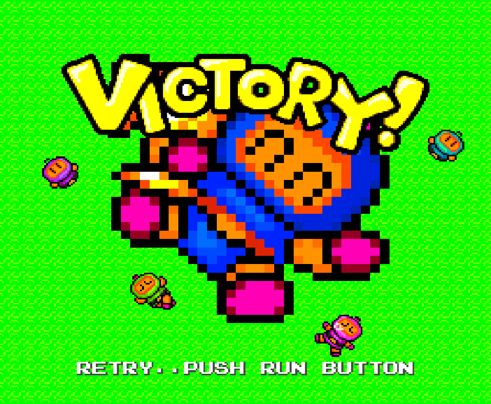 Between worlds, a special little scene will occur showing Bomberman interacting with the boss of the stage, which have a cutesy charm to them After clearing all of the main worlds, the player will gain access to the final world. However, this can be a long road, with the player having limited continues to get through the game. But there is a password and save system, which will allow players to be able to get further into the game.