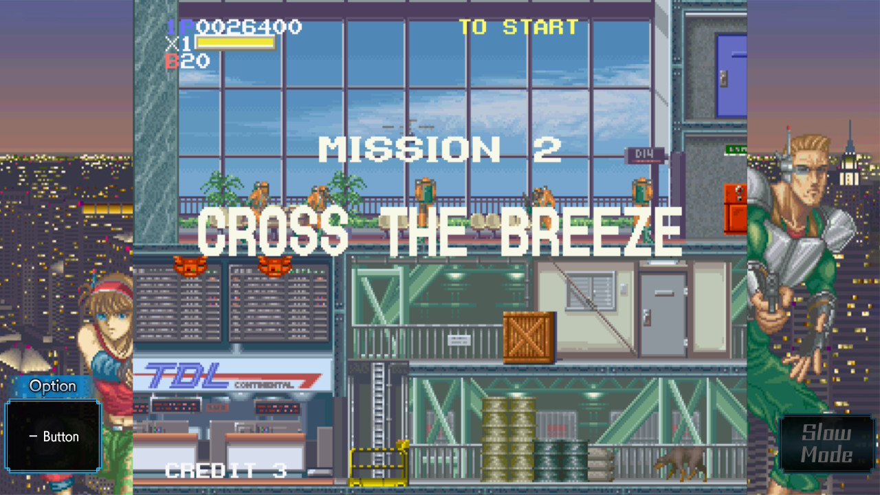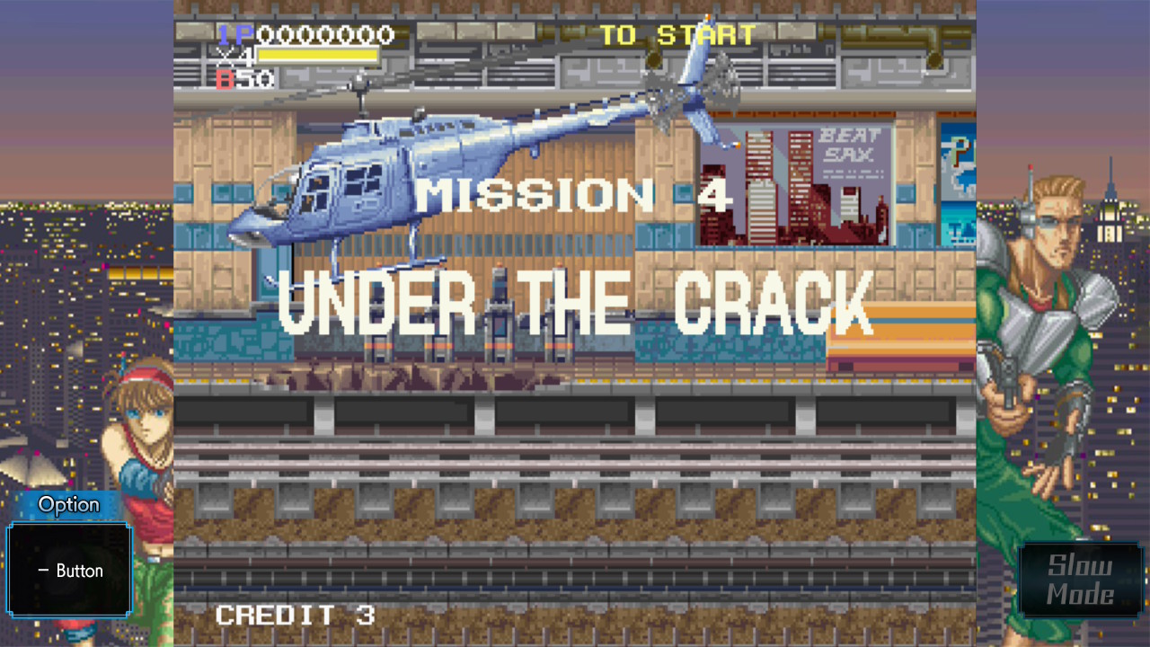 During a run of the game, there are limited credits and lives to make it through the missions. The player can have a maximum of four lives, with three credits to get through the game as standard. However, as this is a special emulated release, there have been new features added, including the ability to toggle infinite credits and even level select. This makes it possible for players to make it through the entire game, easing the challenge for some.