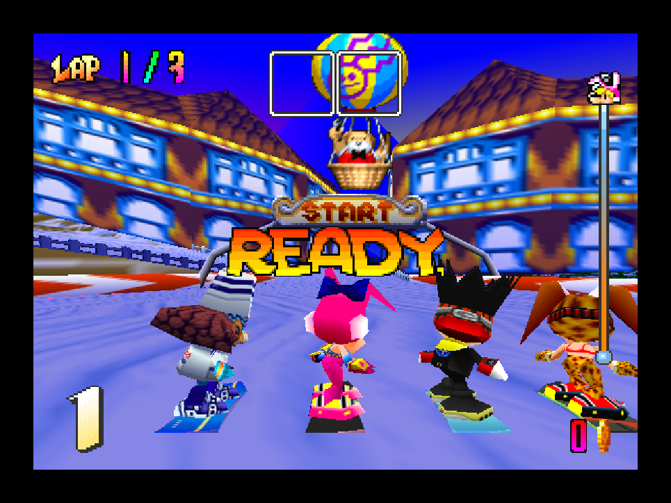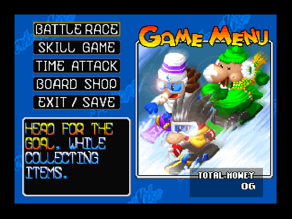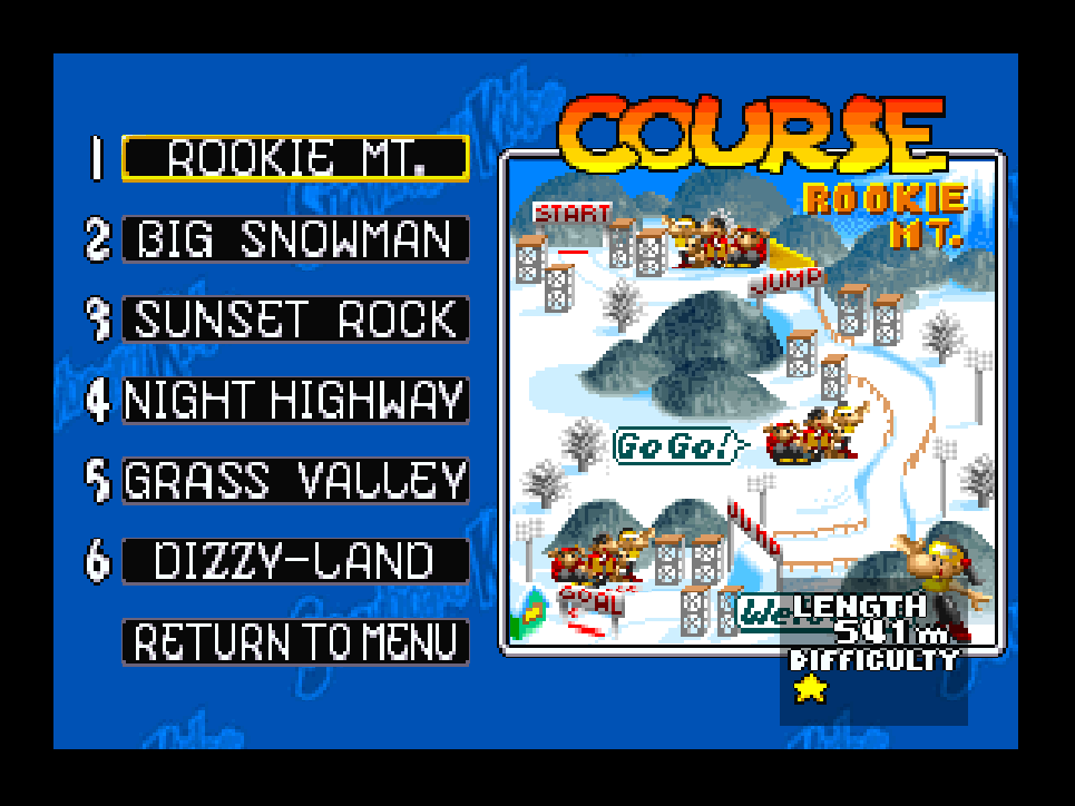 Snowboard Kids is a downhill snowboarding game, where the player can select one of 6 characters, with 5 available at the start and one locked character. At the start of the game, the player can select the number of players that will be playing, with up to four players available to play. After selecting the number of players, the character selection will pop up on screen. Each of the characters have their own unique stats and abilities in play.