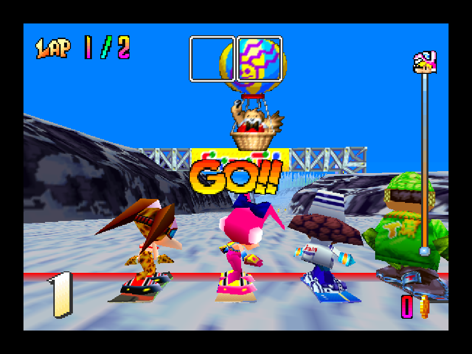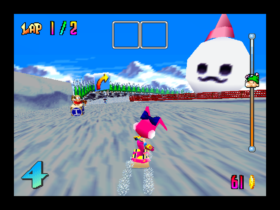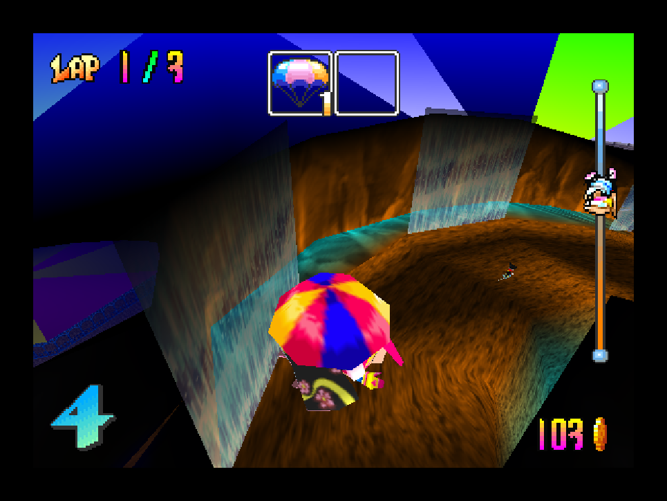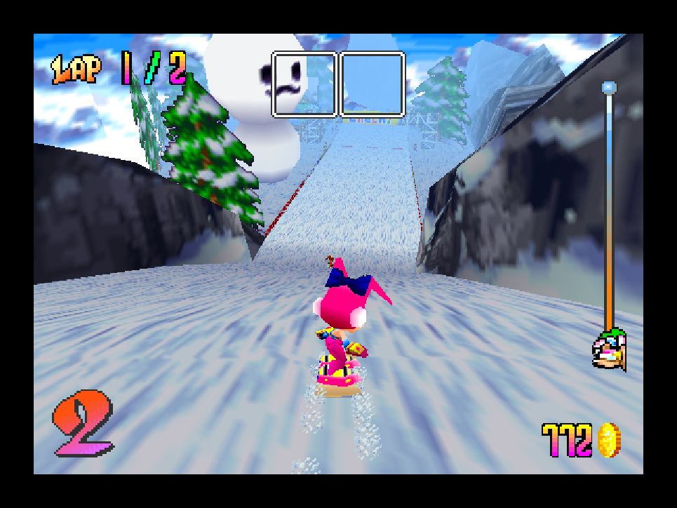 There is no limit to the amount of gold that can be carried, but if the player doesn’t have enough, they will bounce off the item boxes. When this happens, the player will be slowed to a halt, which can also happen when the shop is refilling after use. This makes item use strategic, as the CPU riders will try to grab boxes from time to time. So players will need to decide if they want to use the items, or hold off until later on. Boxes will also overwrite any current item.