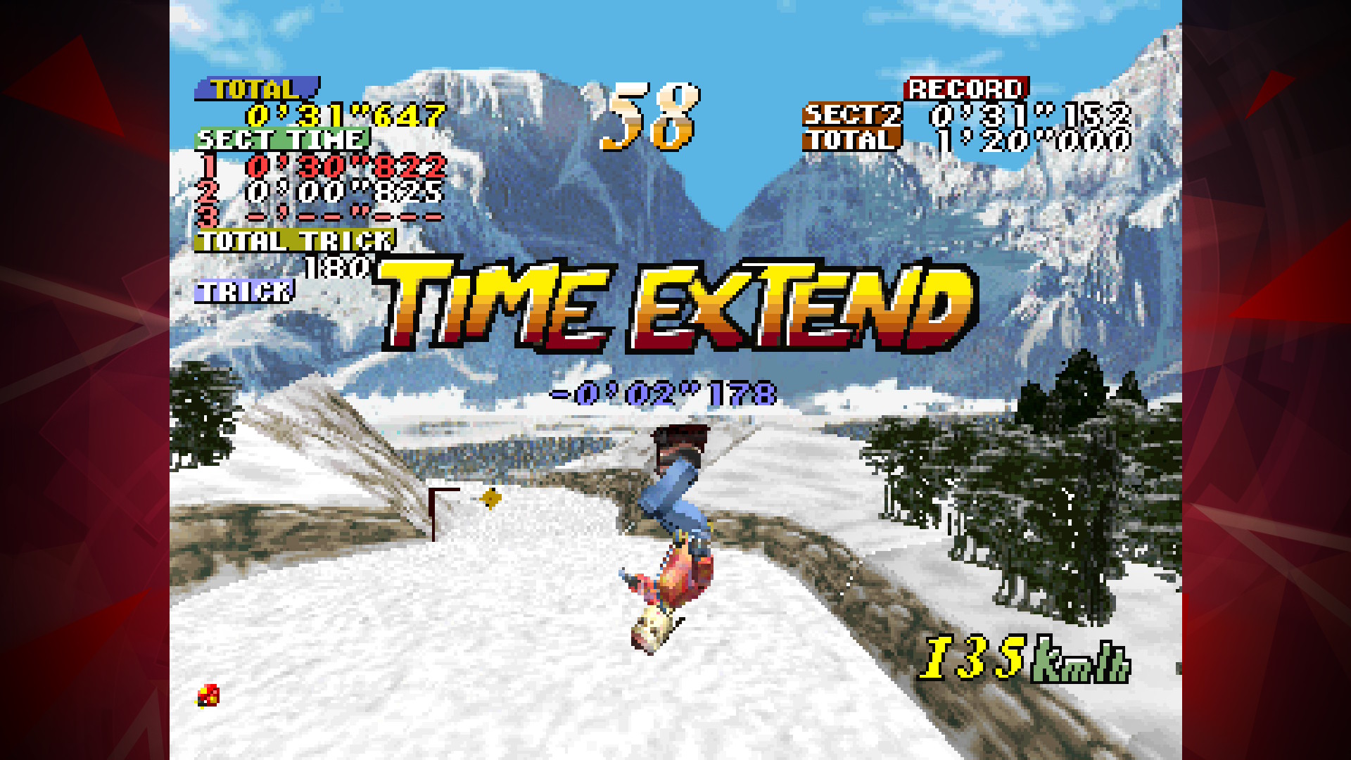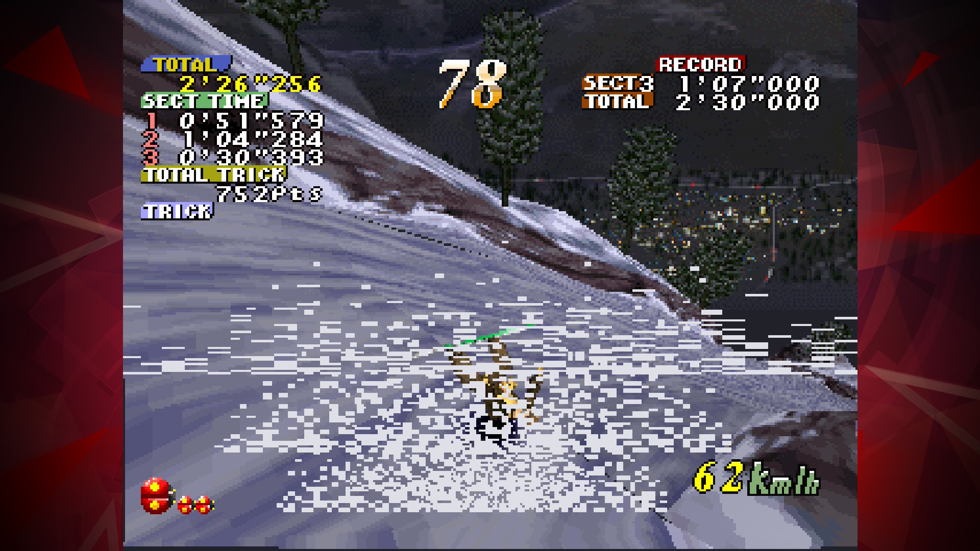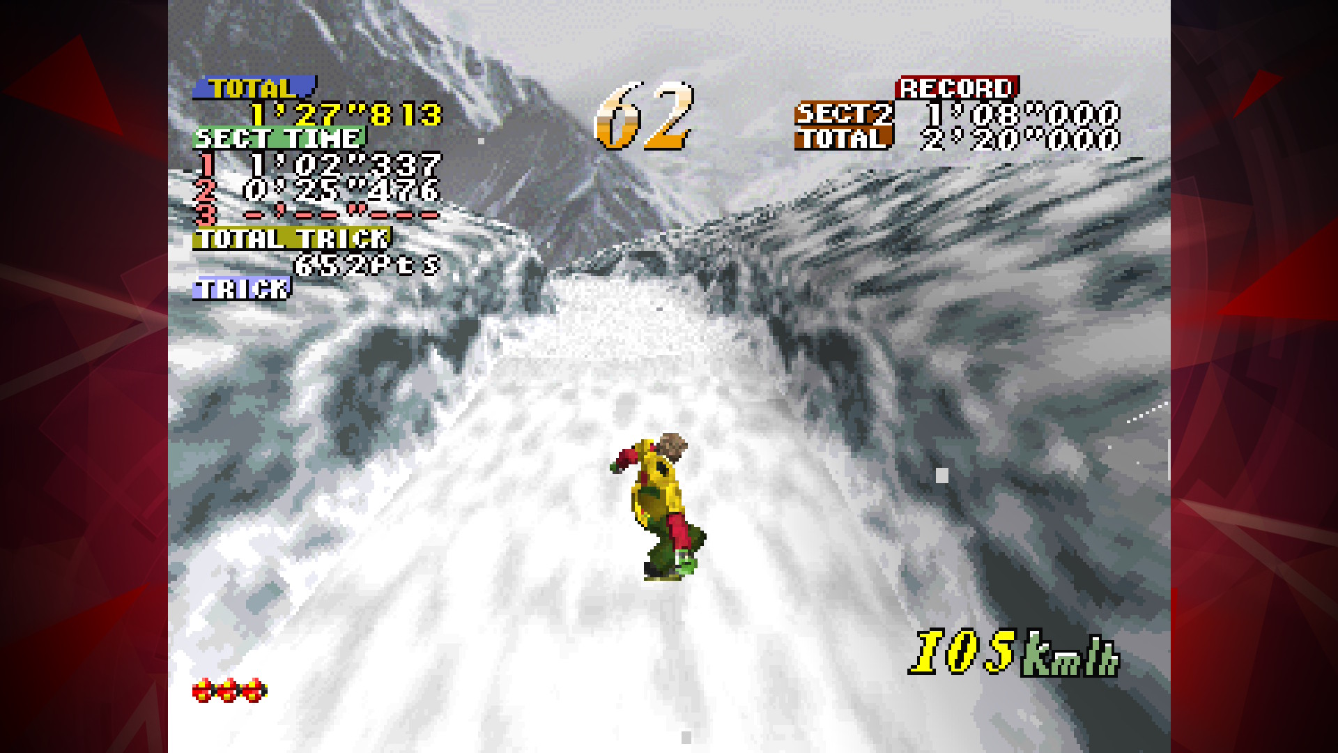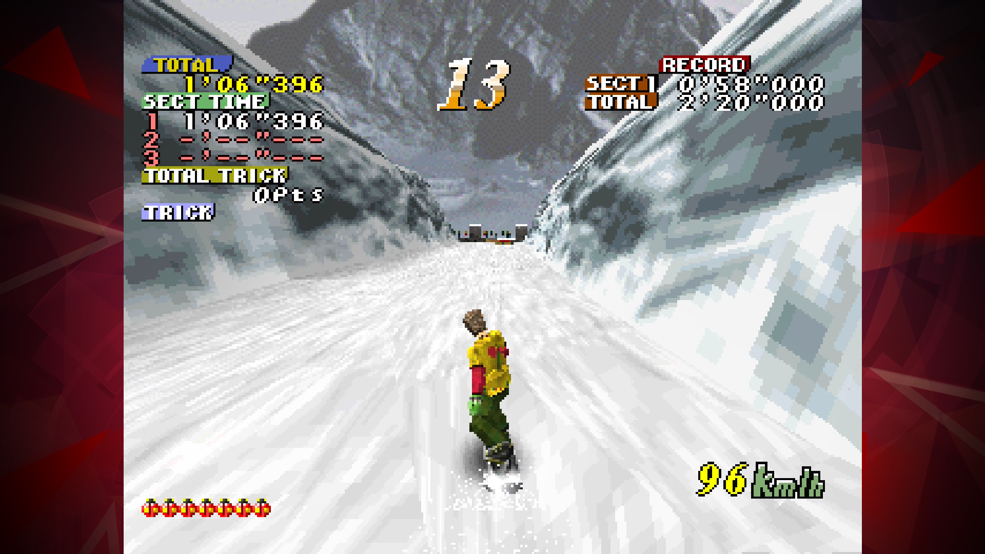 However, if the player turns too hard, or is over-reliant on the drifting, all speed can be lost while riding. It is also possible for the player hit the edges of the slopes, causing the rider to either bounce off or crash, losing speed and time. Managing to maintain a good speed is important to getting a good time, as each of the stages has section records and a full course record to beat. There is also a time limit for the run, which is extended by hitting checkpoints.