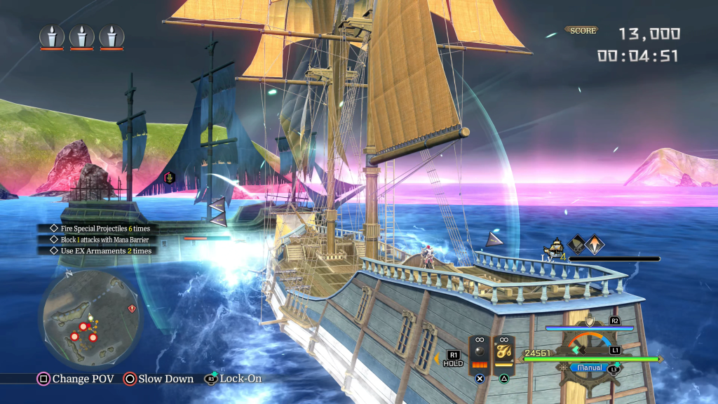 There is the option for manual and auto control of the ship, letting players either go hands-on with control or take a more relaxed approach. If the player wants to cross the waters faster, they can activate the Mana Sail, giving the player a speed boost for a brief time. Starting with a single charge, the player will gain additional charges over the course of the game. Players can also get upgrades for the ship, improving the Sandras and unlocking new abilities.