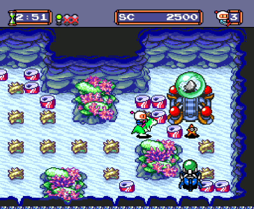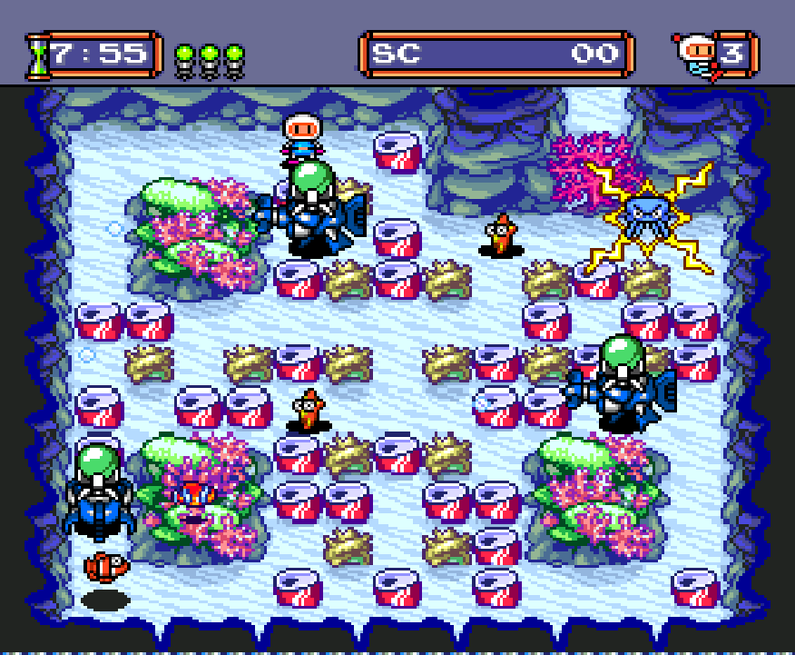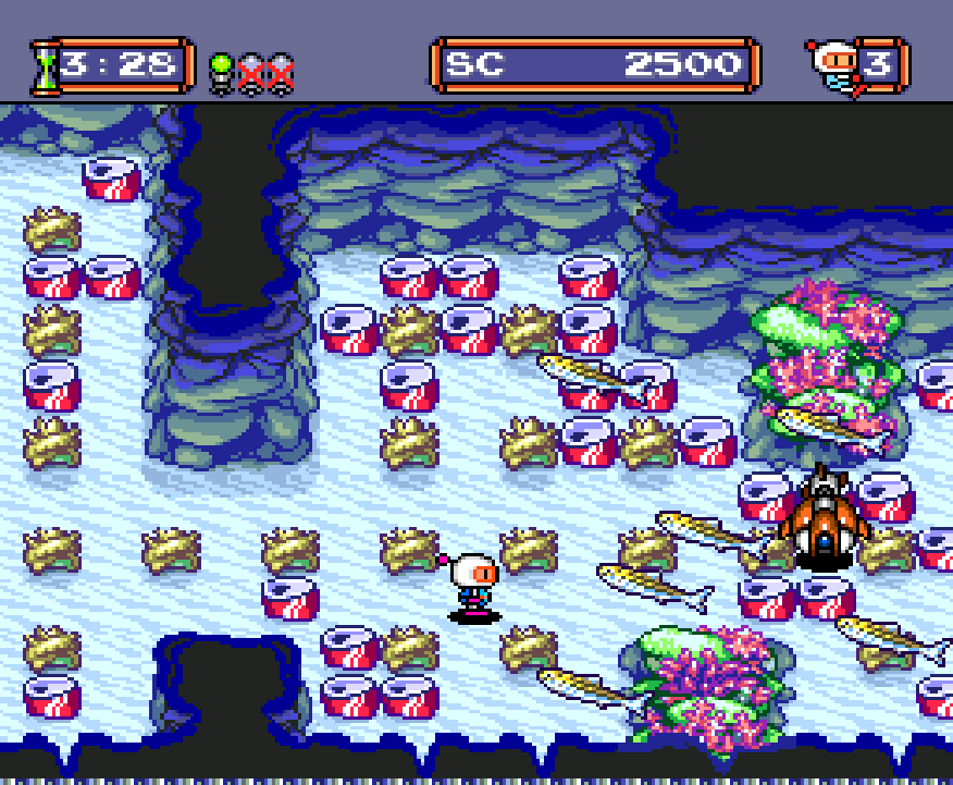 This game takes place across six zones, with the first 5 making up Planet Bomber with the final zone being the villain’s lair. The areas of Planet Bomber are split into different themes, including a Forest, a volcanic mountain and the bottom of the sea. Each of the areas are split into stages, with the player having a single objective, collect the fragment of the Spirit Picture. This is achieved by blowing up the shield beacons, that keep it locked up.