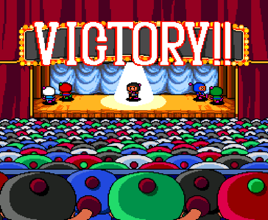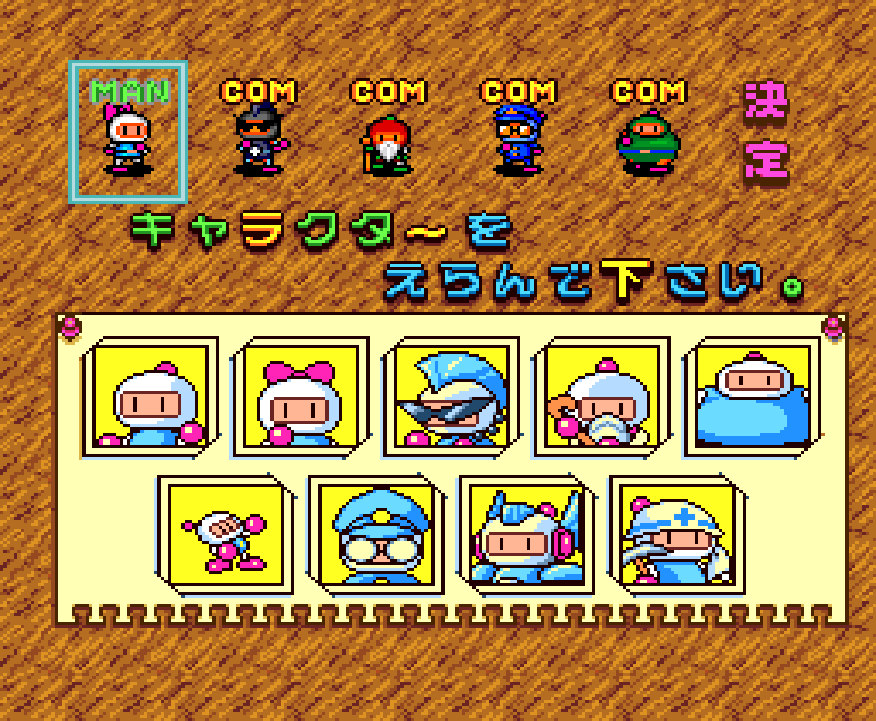 Alongside the single player mode, the battle game is present again, with the option for up to five players to battle it out. There is the option for human and CPU players, allowing players to enjoy the mode alone or with others. This mode has been updated from the previous release, with this version having 9 versions for each Bomberman. The characters have no unique effect for human players, but as CPU enemies, they will have their own unique behaviours.