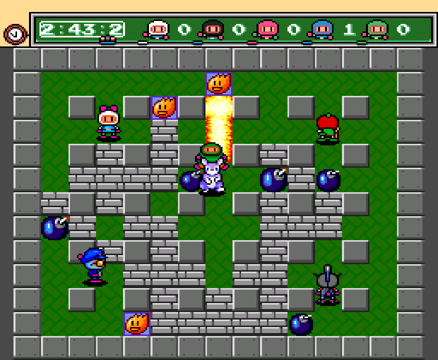 In the stages, the player must navigate the each of the maze like grids, where soft blocks must be destroyed to open up the paths. At the start of the game, or after continuing from a game over, the player has only one bomb and level of fire. By blowing up the soft blocks, the player can also uncover items, which can improve the abilities of Bomberman. The most common are bomb and fire upgrades, increasing the number and length of the flames.