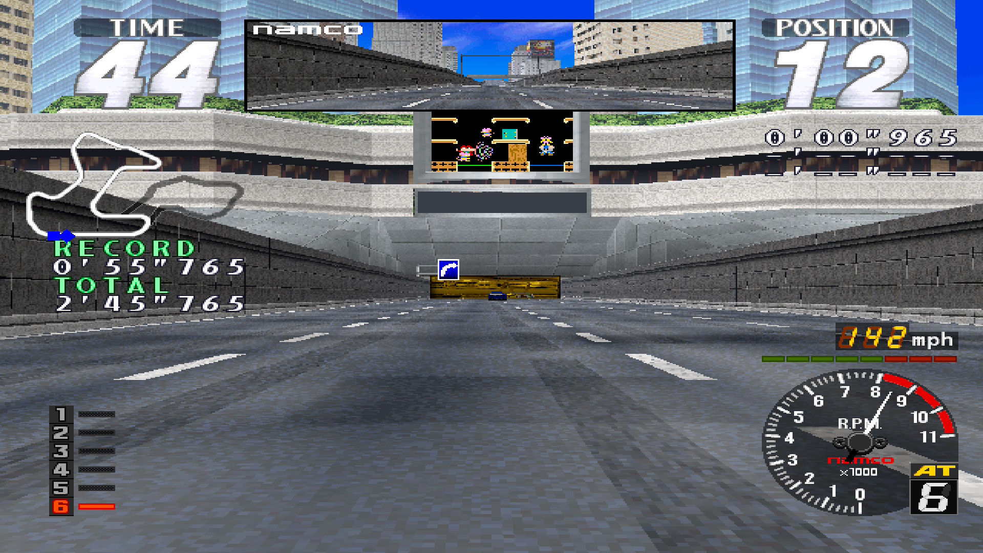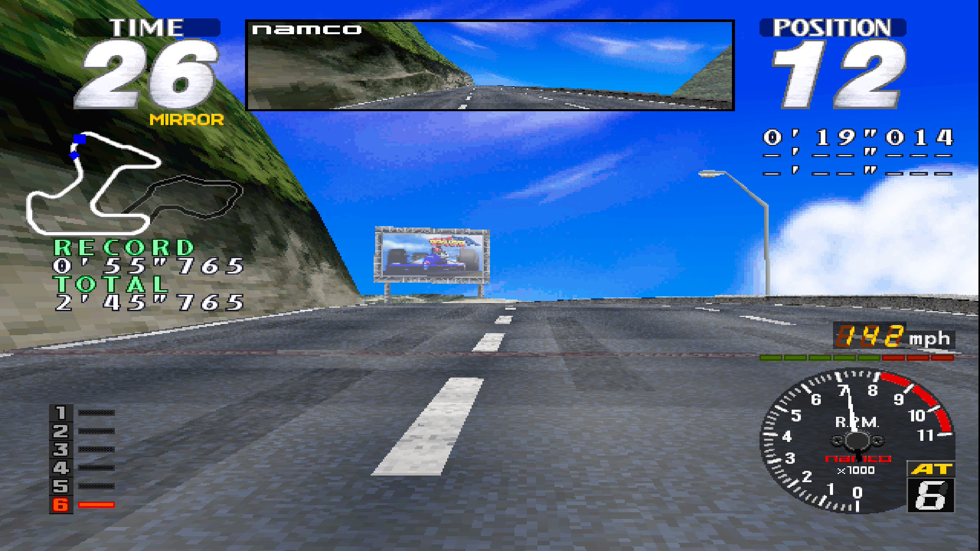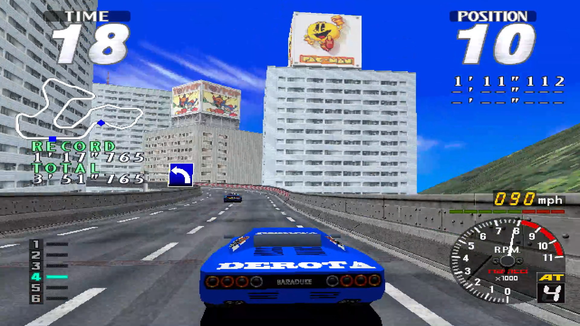 The returning Ridge Racer track and its variants are the same as before, with some cosmetic additions, like billboard signs promoting other Namco titles. These include signs for the original Tekken, Alpine Racer, Cyber Command and signs for classics like Pac-Man and Sky Kid, all of which were available in arcades at this time. Players can also see people watching the races, further adding life to the world the races are taking place in.
