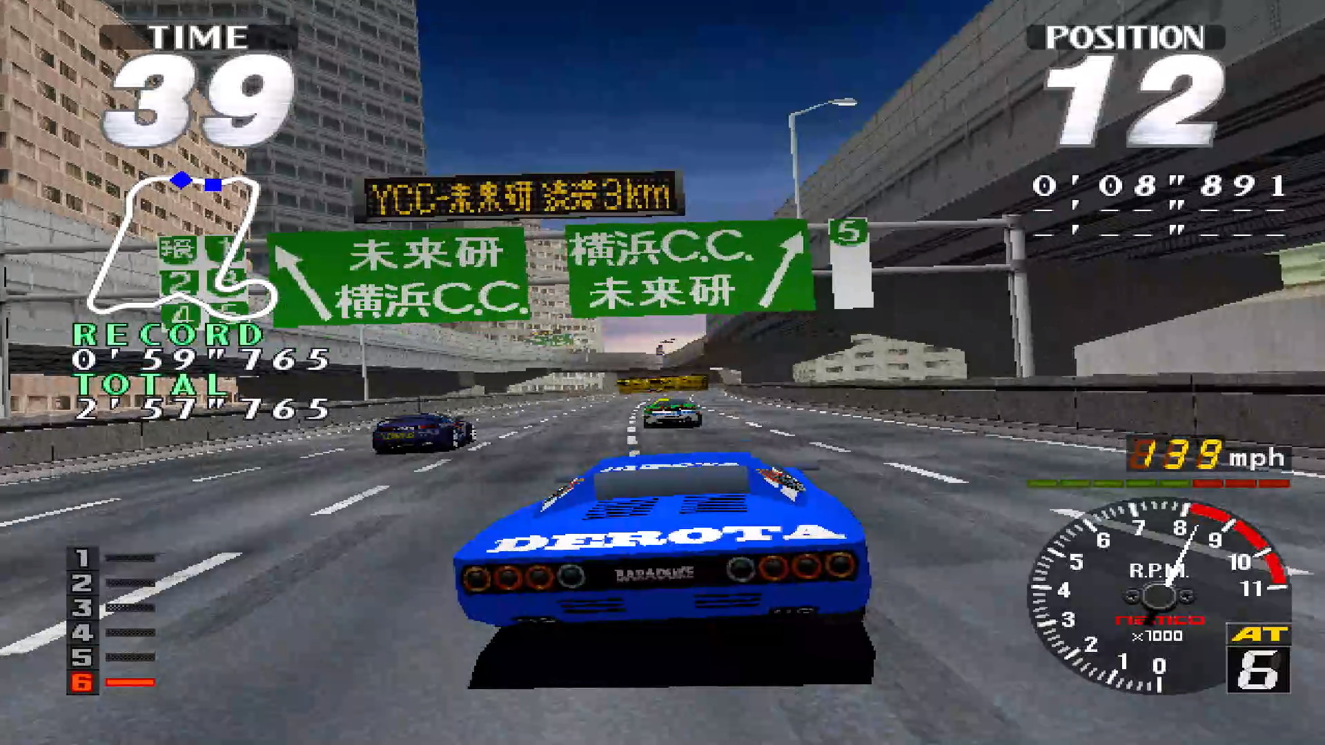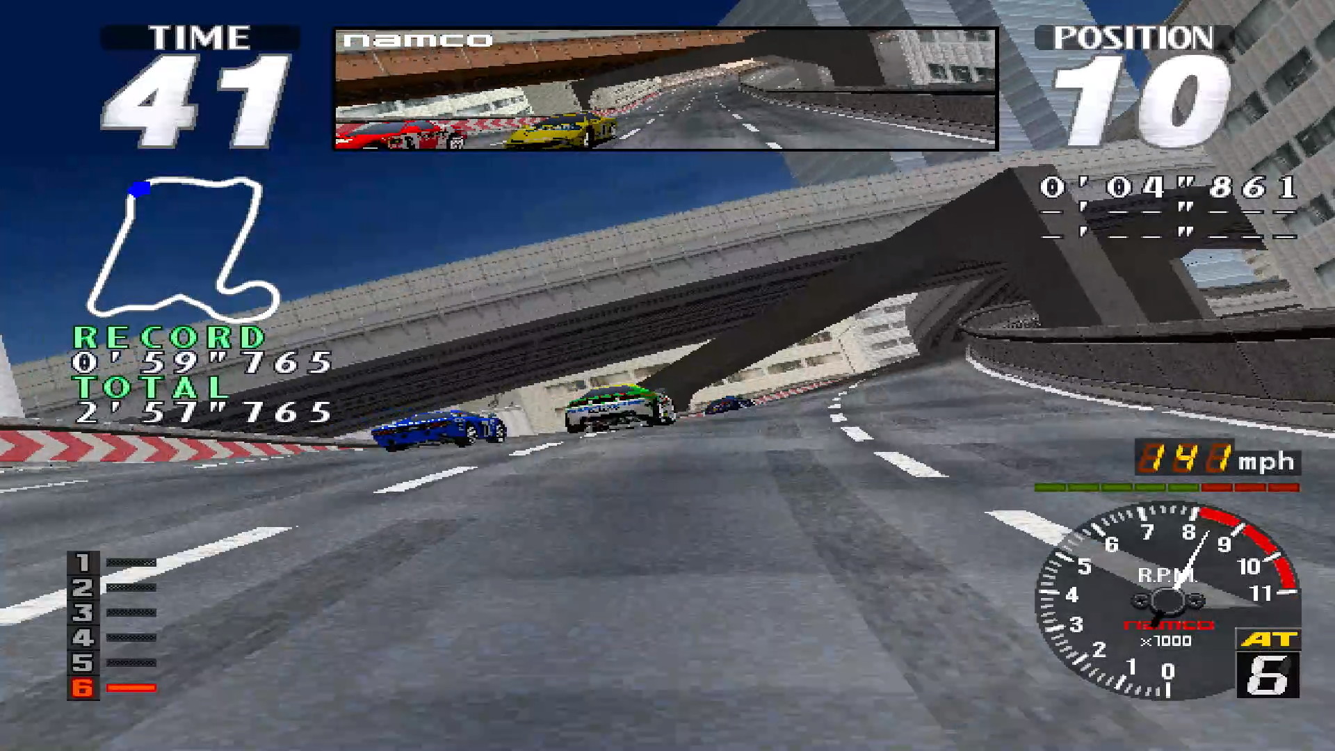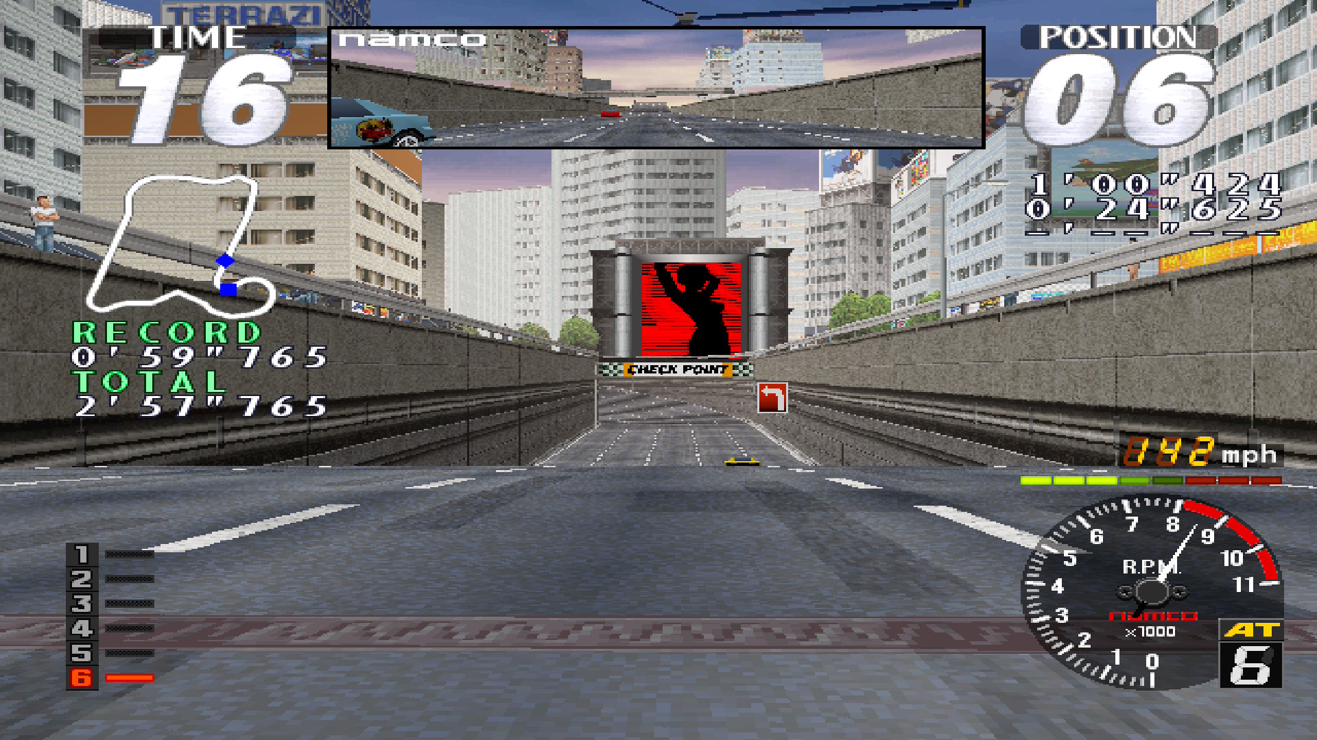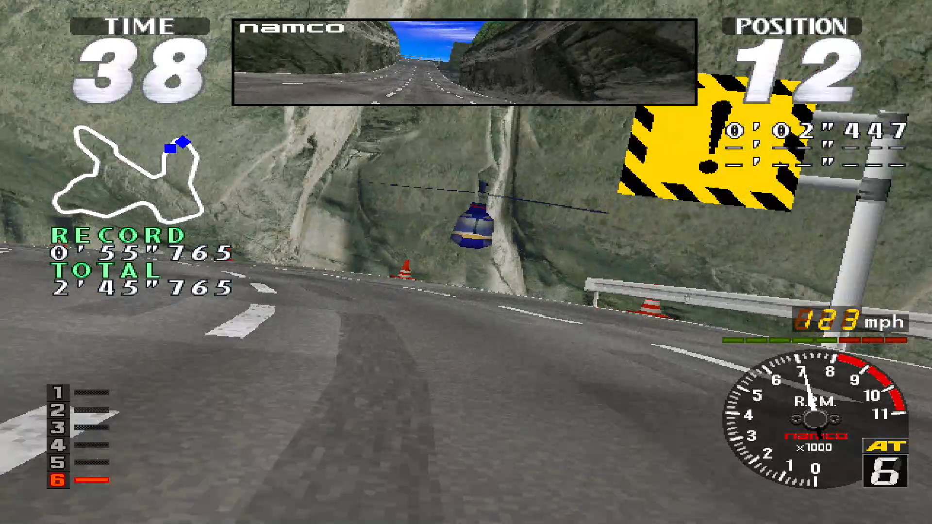 The returning Ridge Racer track and its variants are the same as before, with some cosmetic additions, like billboard signs promoting other Namco titles. These include signs for the original Tekken, Alpine Racer, Cyber Command and signs for classics like Pac-Man and Sky Kid, all of which were available in arcades at this time. Players can also see people watching the races, further adding life to the world the races are taking place in.