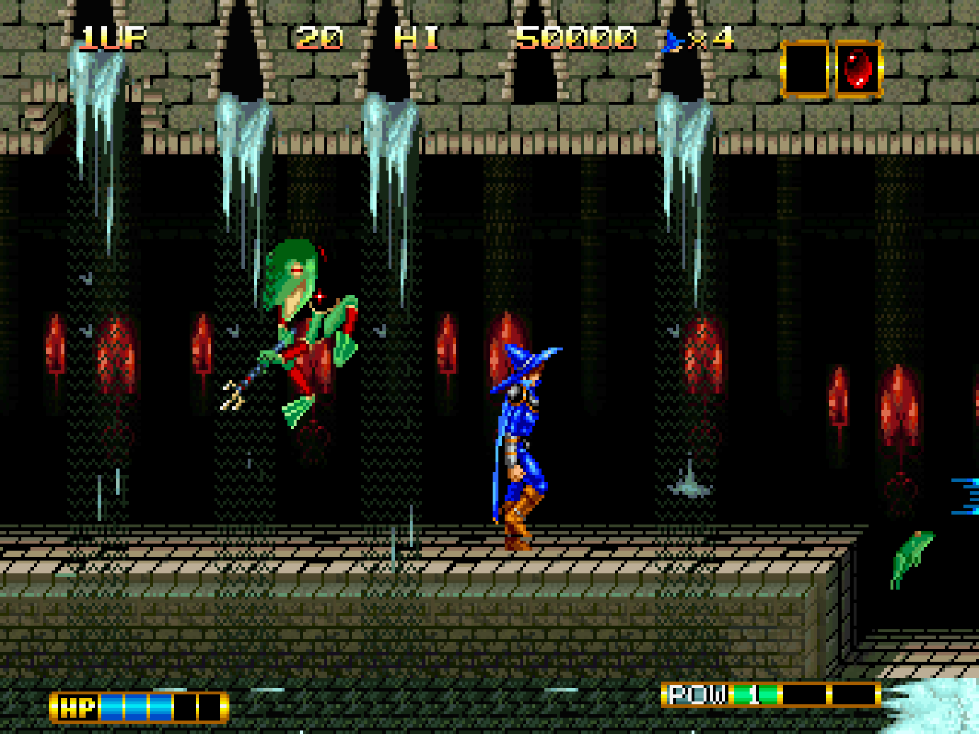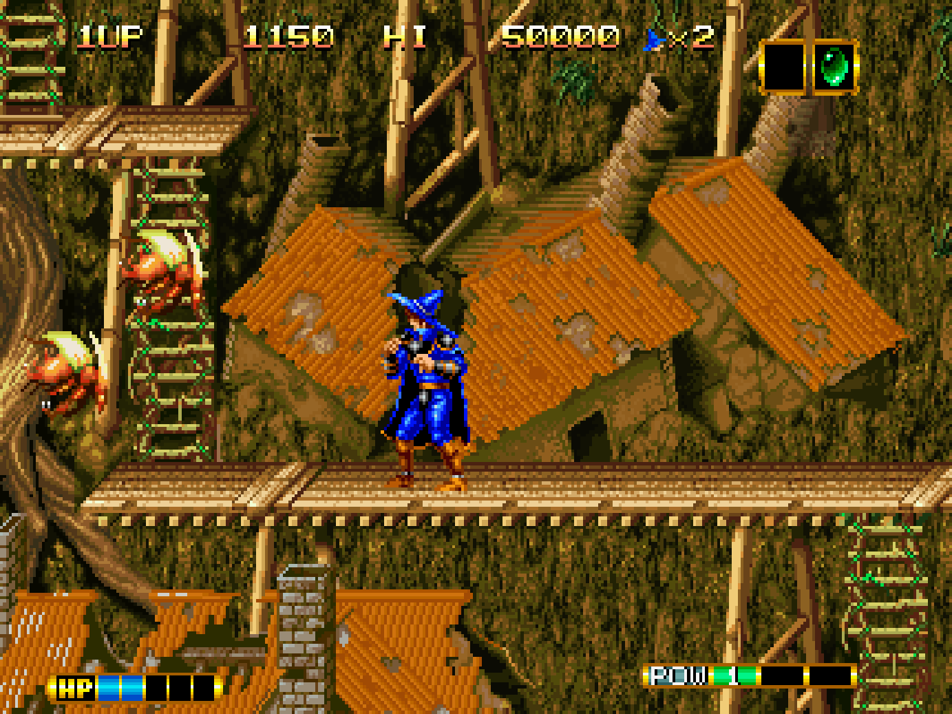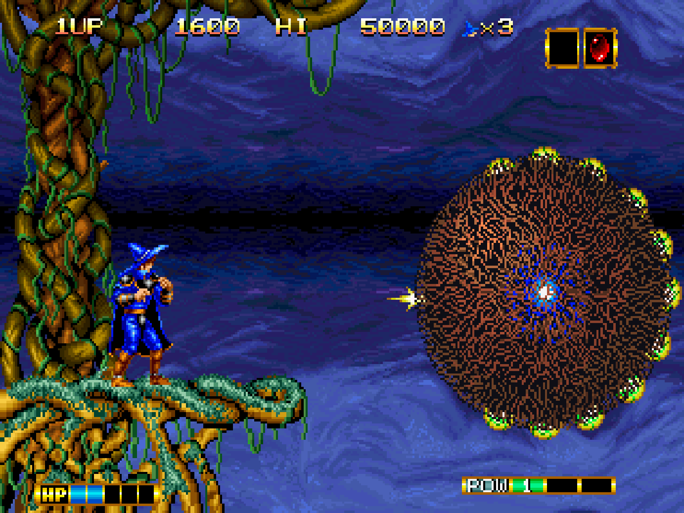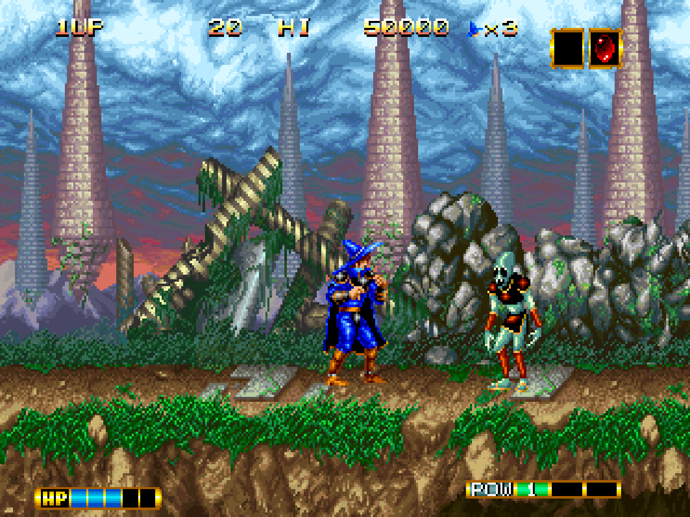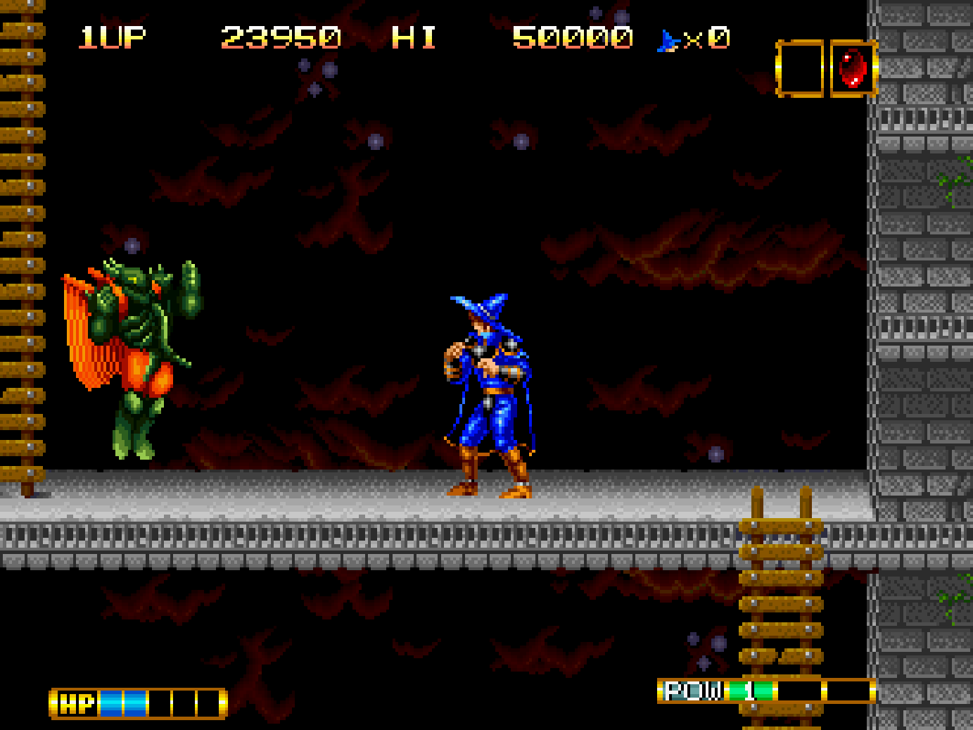 Magician Lord is a side scrolling action game, set in the land of Gadasius which has been thrown into turmoil. Gul-Agieze, an evil sorcerer sealed within the eight volumes of the Sorcerer’s Books has broken free, attacking the land with his army of monsters. His goal is to revive the god of destruction and take over the world. However, the last descendant of the Magician Lord, Elta appears to face this evil to seal Gul-Agieze away once more.