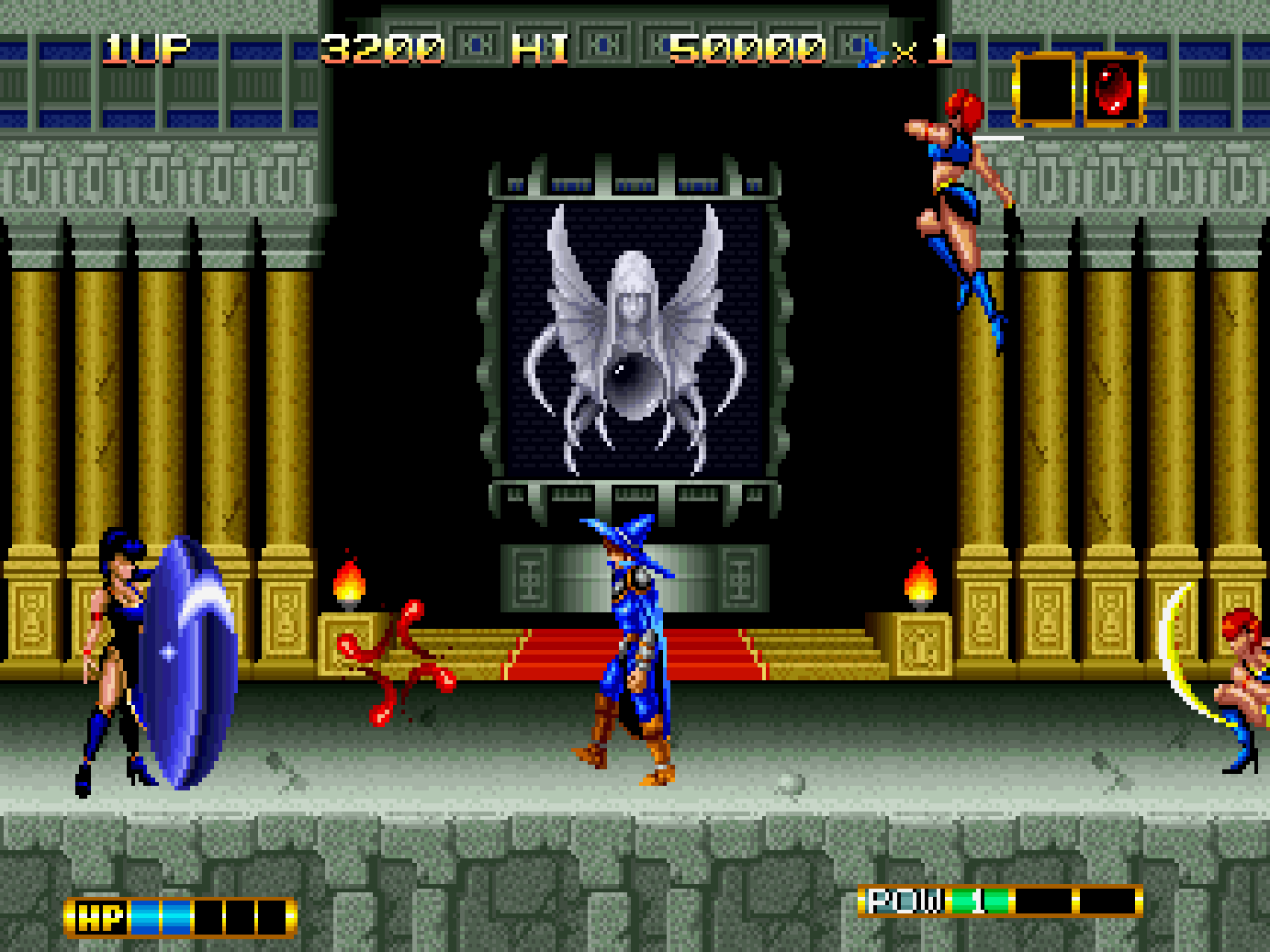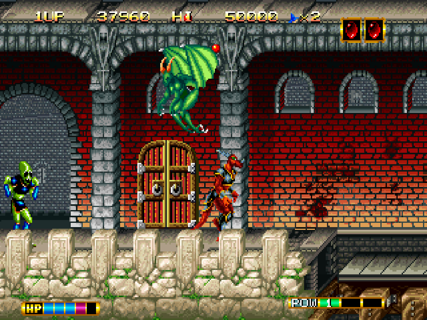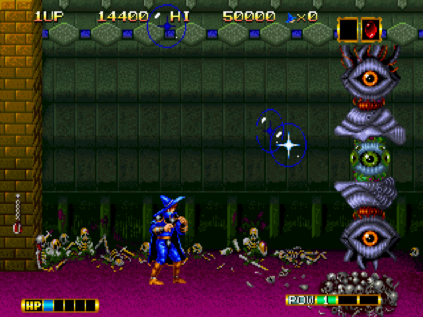 While making their way to the stage goal, players will encounter horrific monsters, with hulking beasts, shambling undead and demonic creatures that can appear. In order to fight the forces of evil, Elta can sling magical projectiles at monsters, but this is limited to two shots at a time. This prevents consistent rapid fire as the attack must disappear, or make contact with an enemy to be used again, making the action very challenging during play.