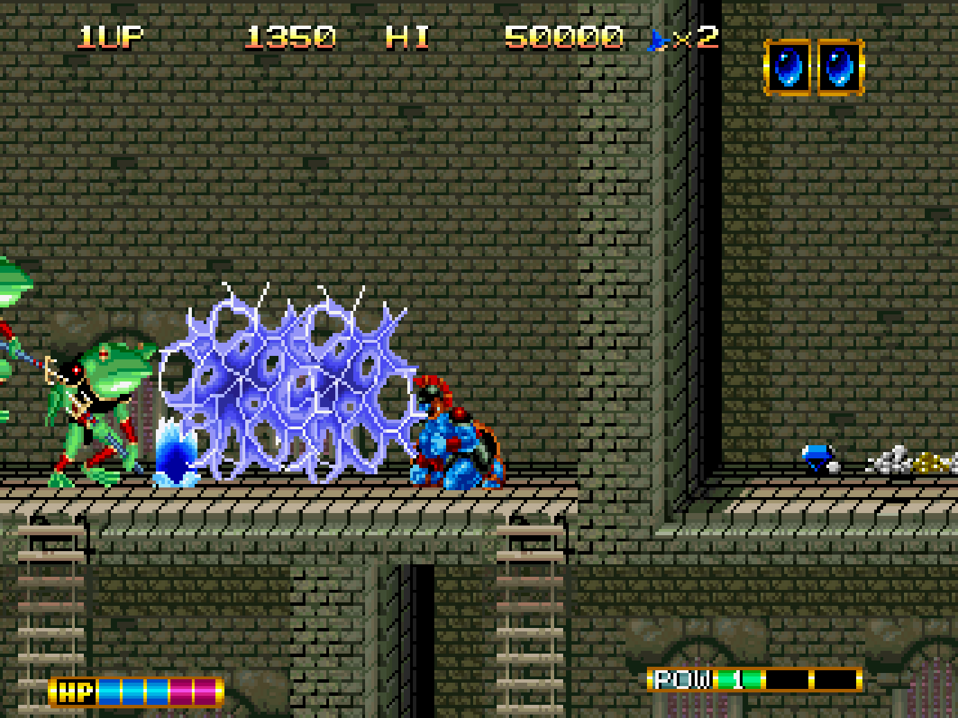 As this is a relatively early action side scroller, it suffers from the unfortunate issue that plagues action games with platforming, knock back when taking damage. Sadly, this issue with knockback is made worse by very short post-hit invincibility, which can lead to repeated damage from enemies. Due to this it is very easy to die during play, as players start each life with 2 health points at default settings, but this can be changed in the settings.