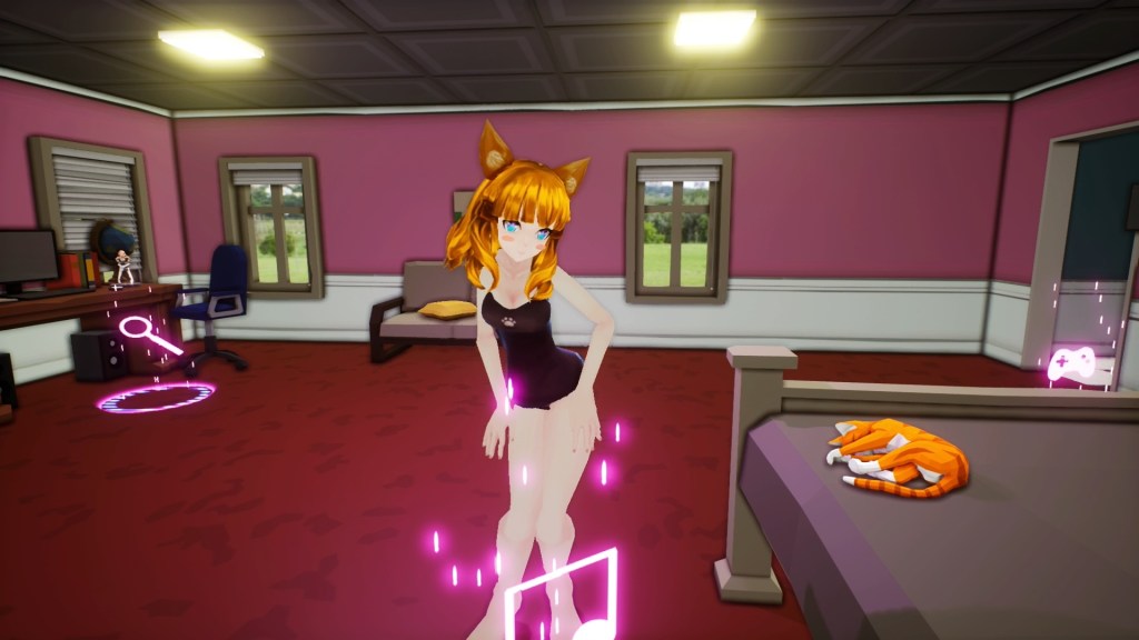 Outside of the puzzles there are some simple activities that can be accessed in the two explorable rooms. These rooms are a bedroom and bathroom, which can be explored in a free roaming manner. The player character can move freely around the room, activating an activity when touching a marker on the floor, with one for each activity. The main marker is by the computer, where the puzzles are located with three additional activity markers.